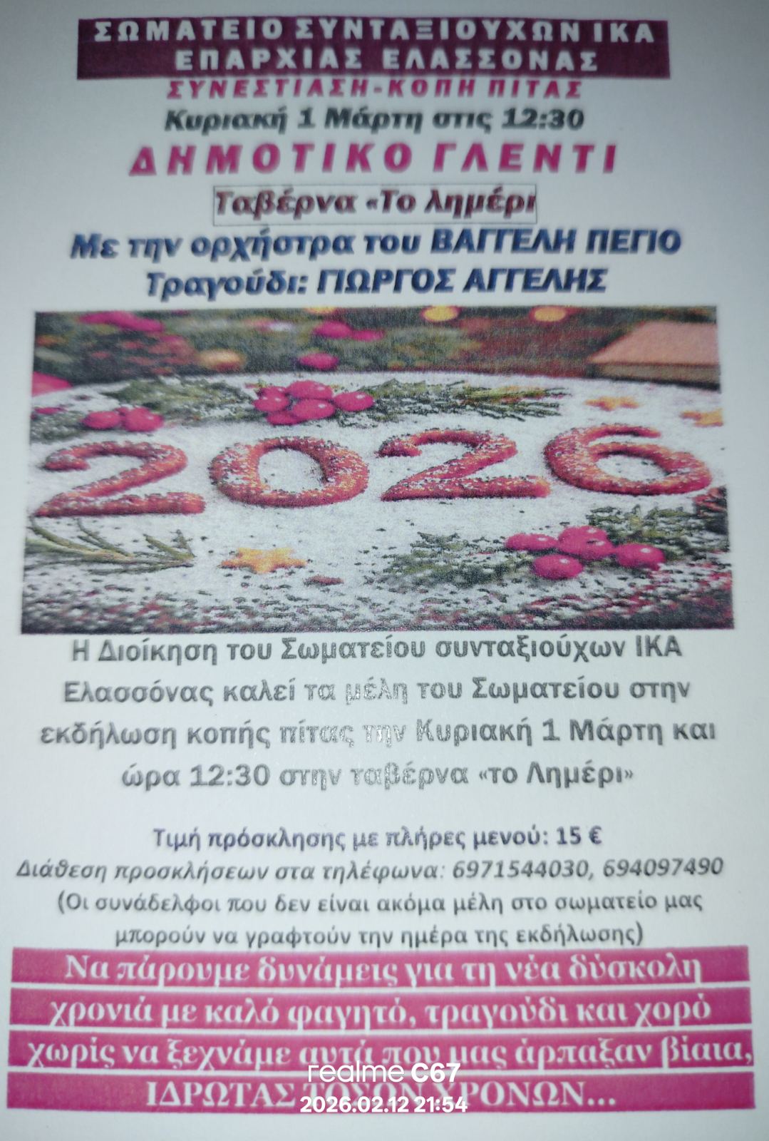 Το Σωματείο Συνταξιούχων ΙΚΑ Επαρχίας Ελασσόνας καλεί τα μέλη του και όλους τους συνάδελφους συνταξιούχους του ΙΚΑ και του ΟΓΑ στην εκδήλωση κοπής πίτας τη 1η Μάρτη 2026 στις 12:30 στην ταβέρνα «το Λημέρι». Θα γίνει ενημέρωση για τις εξελίξεις και θα ακολουθήσει καλό φαγητό, ποτό και μουσική από την ορχήστρα του Βαγγέλη Πέγιου.