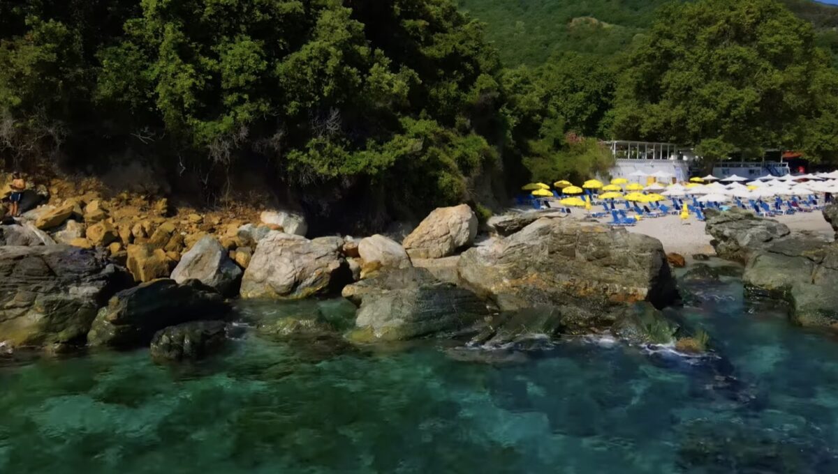 Στην πλάτη της παραλίας, τεράστια πλατάνια κατεβαίνουν σχεδόν ως το κύμα, ρίχνοντας σκιά βαριά και δροσερή πάνω στην άμμο, φυσικές ομπρέλες που φυλάνε τους ανθρώπους από τον ήλιο και κρατούν τη μνήμη του βουνού ακόμη και στην καρδιά του καλοκαιριού. Δεξιά κι αριστερά, βράχοι υψώνονται σαν σιωπηλοί φρουροί, κλείνοντας απαλά τον κόλπο και χαρίζοντας στην παραλία μια αίσθηση προστατευμένης αγκαλιάς, μια μικρή εξωτική κοιλότητα όπου ο κόσμος μοιάζει να περιορίζεται στο νερό, στο φως και στο θρόισμα των φύλλων.