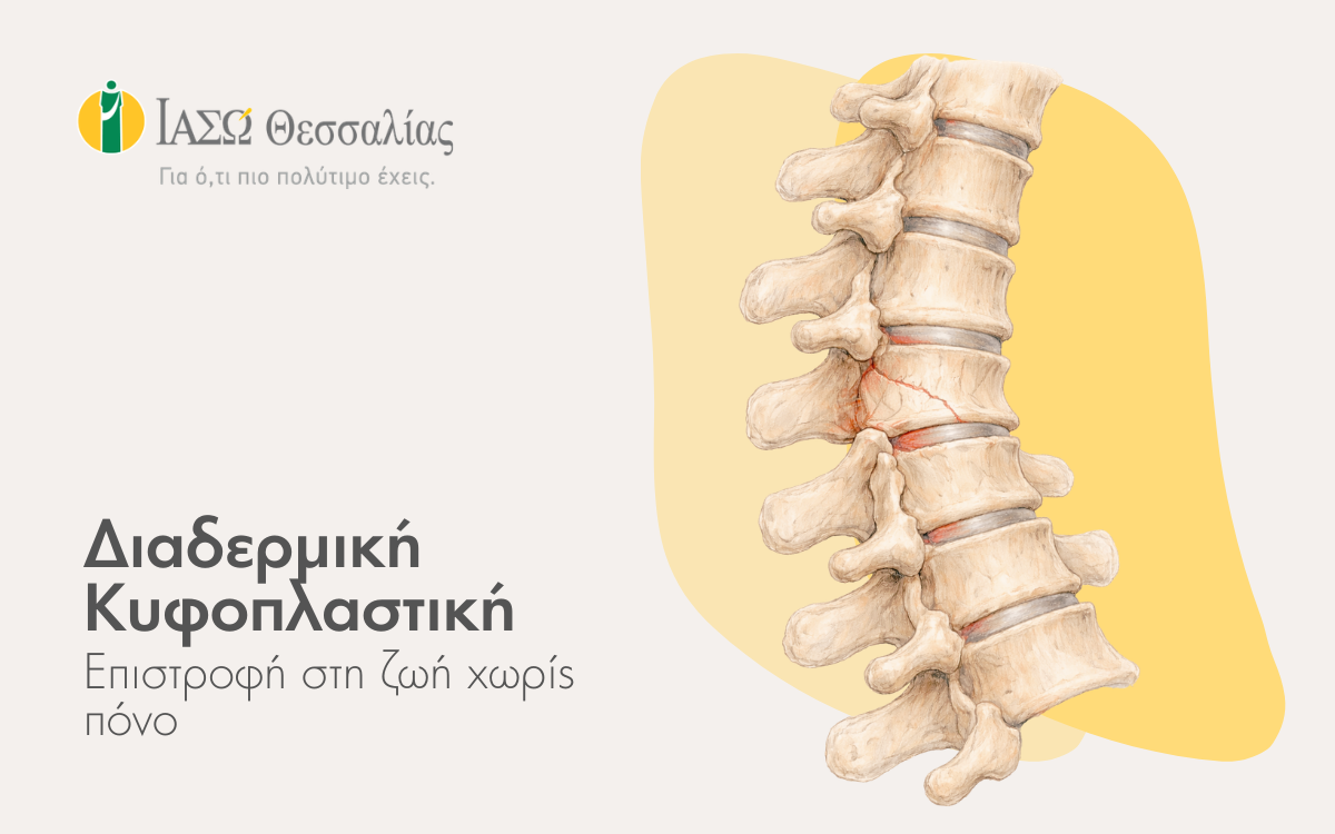 Η Διαδερμική κυφοπλαστική αποτελεί τη σύγχρονη μέθοδο ελάχιστης επεμβατικότητας για την άμεση θεραπεία των συμπιεστικών οστεοπορωτικών σπονδυλικών καταγμάτων. Πρόκειται για κατάγματα των σπονδυλικών σωμάτων που σχηματίζουν τη σπονδυλική στήλη, χωρίς να απαιτούνται μεγάλες τομές δέρματος και μαλακών μορίων και χωρίς την αναγκαιότητα χρήσης βιδών ή ράβδων, δηλαδή σπονδυλοδεσίας η άλλων μεταλλικών εμφυτευμάτων.