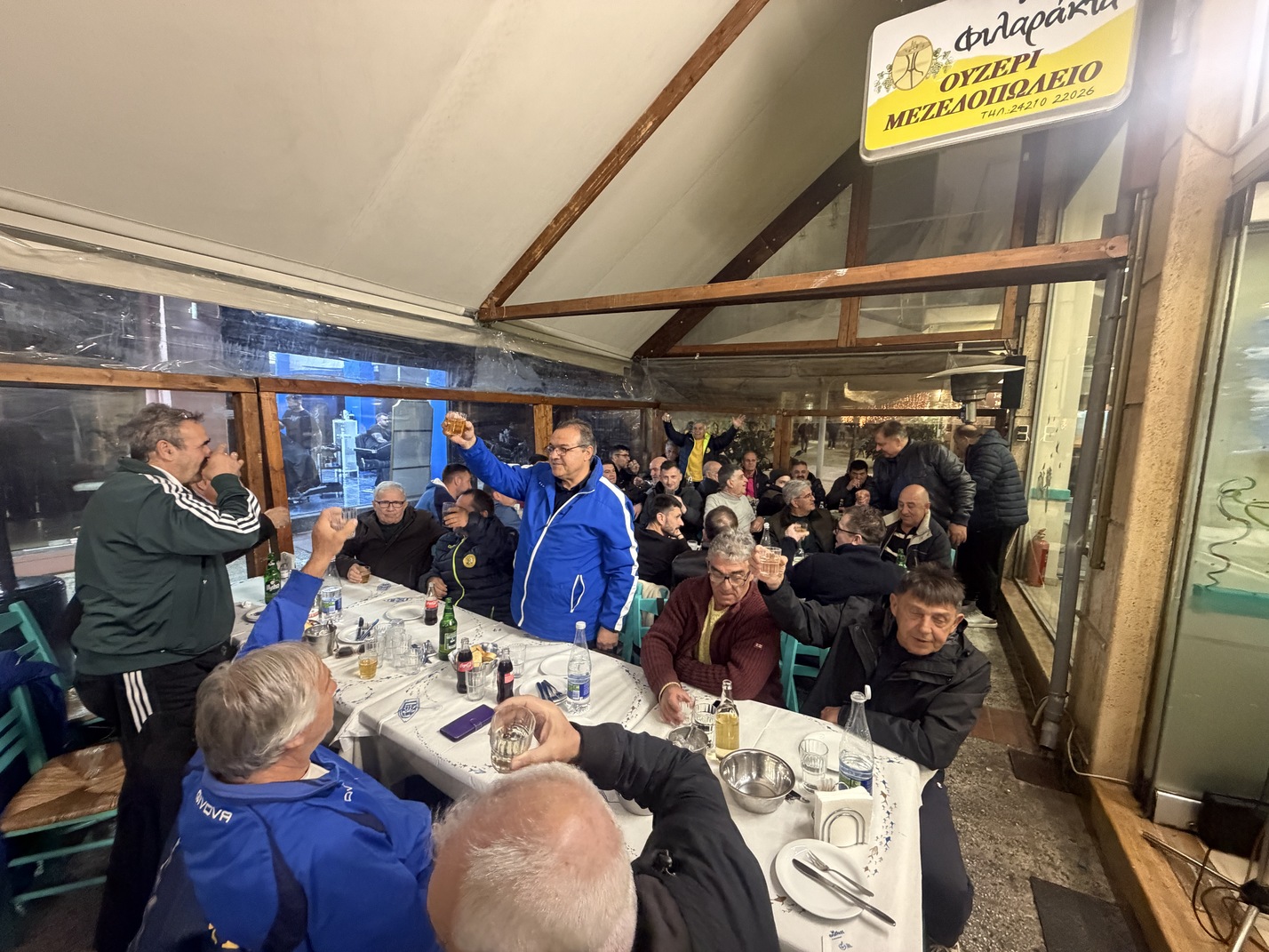 Μετά τη λήξη του αγώνα ακολούθησε γεύμα, όπου οι παλαίμαχοι είχαν την ευκαιρία να θυμηθούν όμορφες ποδοσφαιρικές στιγμές, να αναβιώσουν παλιές φιλίες και να ενισχύσουν ακόμη περισσότερο τους δεσμούς που τους ενώνουν όλα αυτά τα χρόνια.