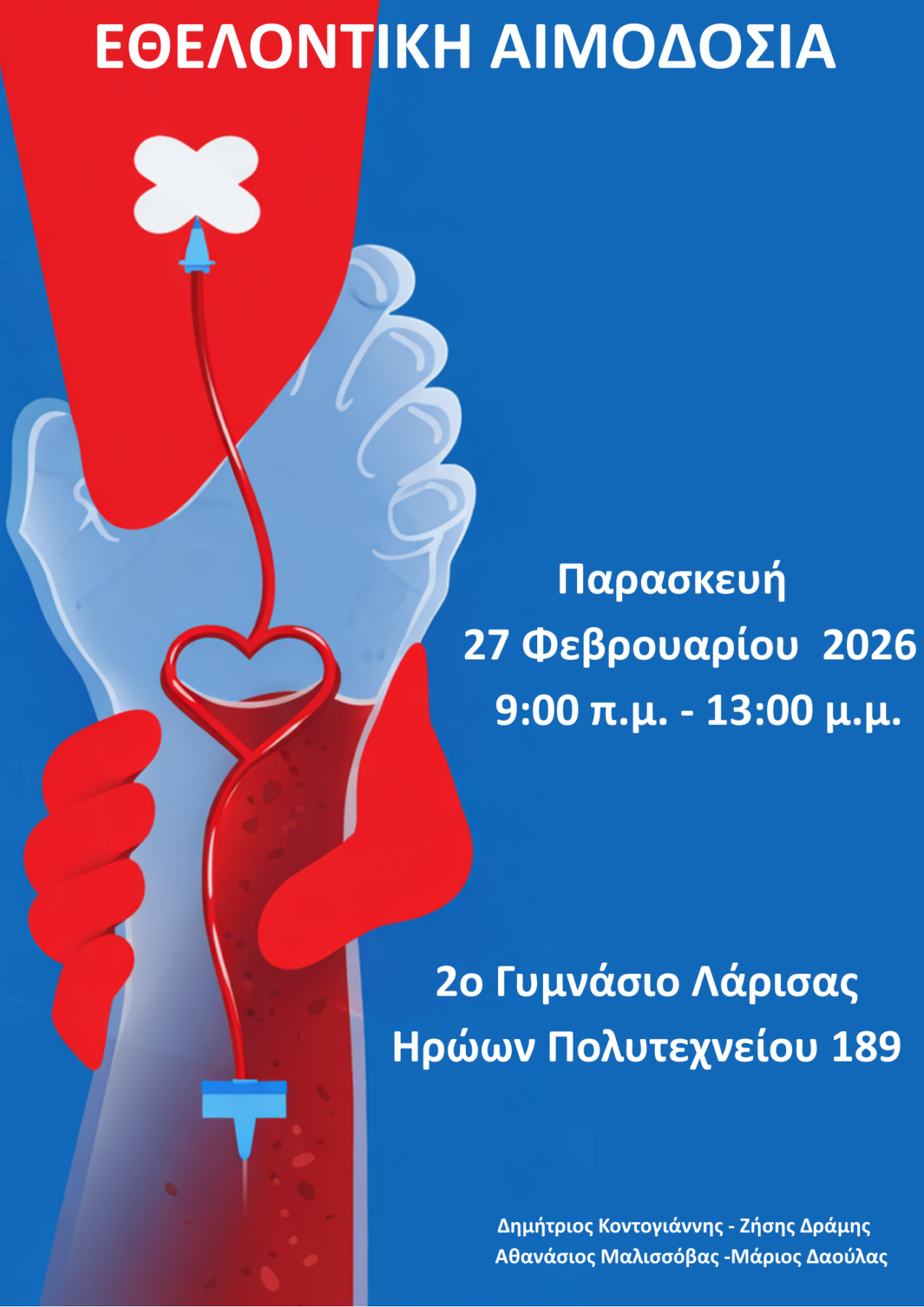 Με κεντρικό σύνθημα την προσφορά και την αλληλεγγύη, ο Σύλλογος Εθελοντών Αιμοδοτών του 2ου Γυμνασίου Λάρισας, σε μια ξεχωριστή συνεργασία με το 2ο Γενικό Λύκειο Λάρισας, το Πρότυπο Γυμνάσιο Λάρισας και το Πρότυπο Λύκειο Λάρισας, απευθύνει ανοιχτό κάλεσμα για συμμετοχή στην κοινή τους εθελοντική δράση. Η εκδήλωση πραγματοποιείται με την πολύτιμη συμβολή του Τμήματος Αιμοδοσίας του Γενικού Νοσοκομείου Λάρισας την Παρασκευή, 27 Φεβρουαρίου 2026, από τις 09:00 π.μ. έως τις 13:00 μ.μ., στον ειδικά διαμορφωμένο χώρο του ισογείου του 2ου Γυμνασίου Λάρισας (Ηρώων Πολυτεχνείου 189).