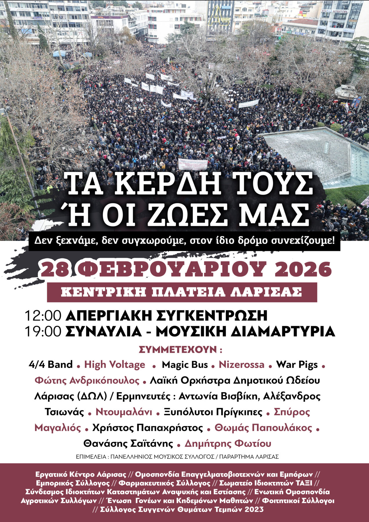 Στις 28 Φεβρουαρίου μουσικοί και καλλιτέχνες θα ενωθούμε με το μεγάλο λαϊκό ποτάμι στους δρόμους της Λάρισας και όλης της χώρας!