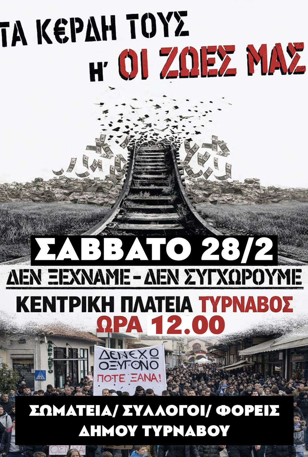 Η Δημοτική Αρχή Τυρνάβου συμμετέχει και στηρίζει τη συγκέντρωση που διοργανώνουν σωματεία, σύλλογοι και μαζικοί φορείς του Δήμου Τυρνάβου, σήμερα Σάββατο 28 Φλεβάρη στις 12:00 στην κεντρική πλατεία Τυρνάβου.