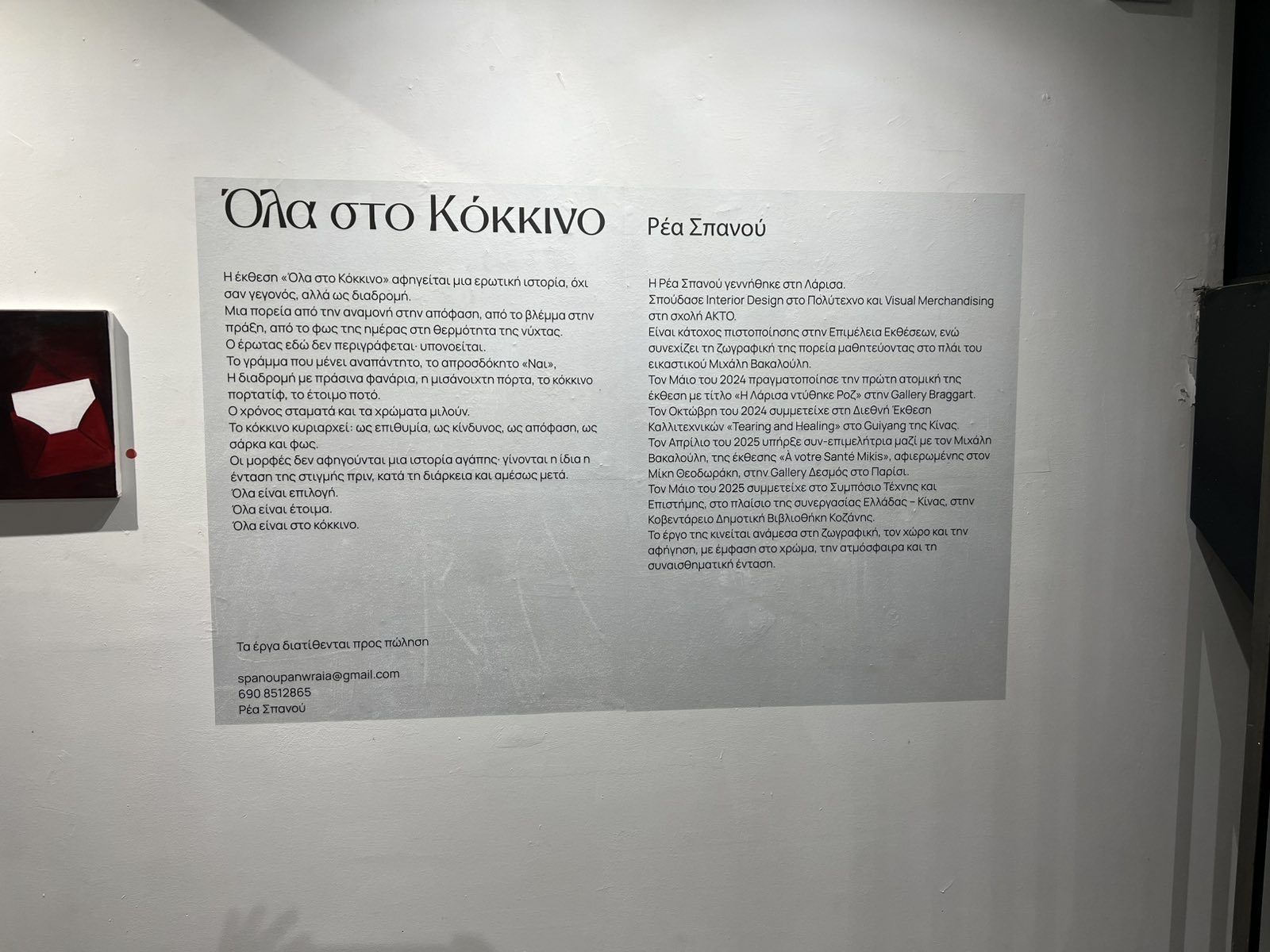 Η έκθεση «Όλα στο Κόκκινο» αφηγείται μια ερωτική ιστορία όχι ως γεγονός, αλλά ως διαδρομή. Μια πορεία από την αναμονή στην απόφαση, από το βλέμμα στην πράξη και από το φως της ημέρας στη θερμότητα της νύχτας.