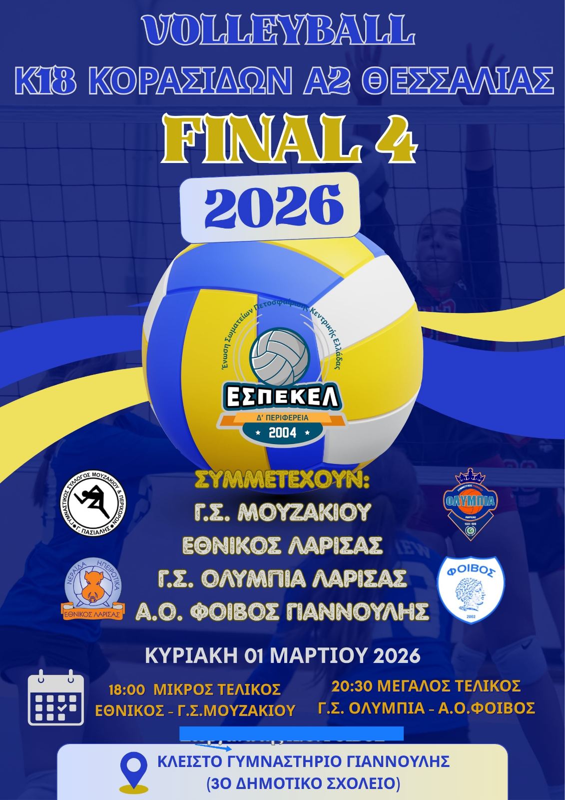 Σήμερα, Κυριακή 1 Μαρτίου 2026, θα διεξαχθούν οι τελικοί του Final 4 Κορασίδων Α2 Θεσσαλίας στο Κλειστό Γυμναστήριο Γιάννουλης, ολοκληρώνοντας μια πολύ ωραία διοργάνωση γεμάτη ένταση και δυνατές εμφανίσεις.