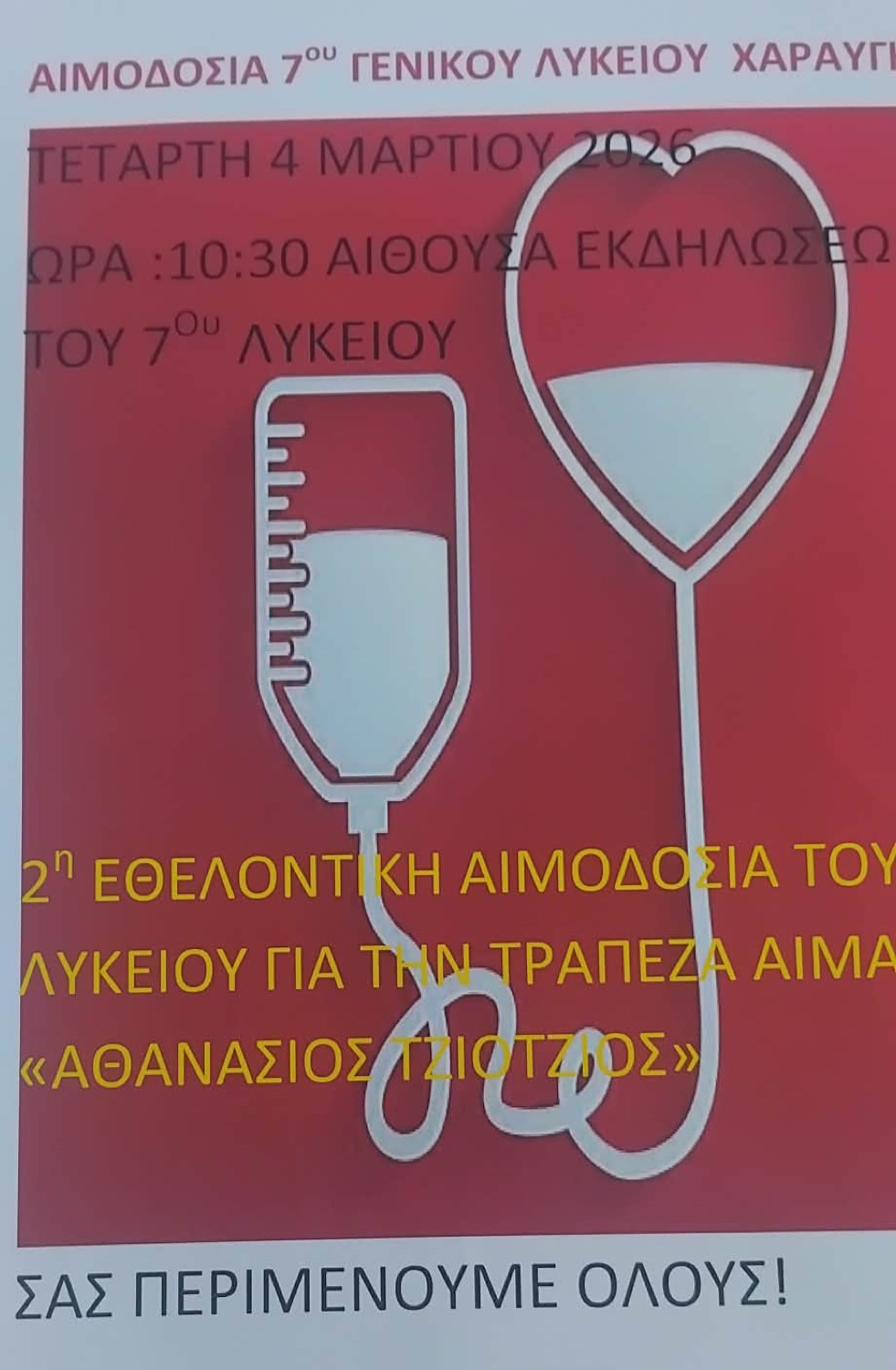 Αύριο Τετάρτη στις 10.30 το πρωί, το 7ο Γενικό Λύκειο Λάρισας (Χαραυγή), θα πραγματοποιήσει τη 2η Εθελοντική Αιμοδοσία για την Τράπεζα Αίματος “ΑΘΑΝΑΣΙΟΣ ΤΖΙΟΤΖΙΟΣ”, στην αίθουσα εκδηλώσεων του σχολείου.