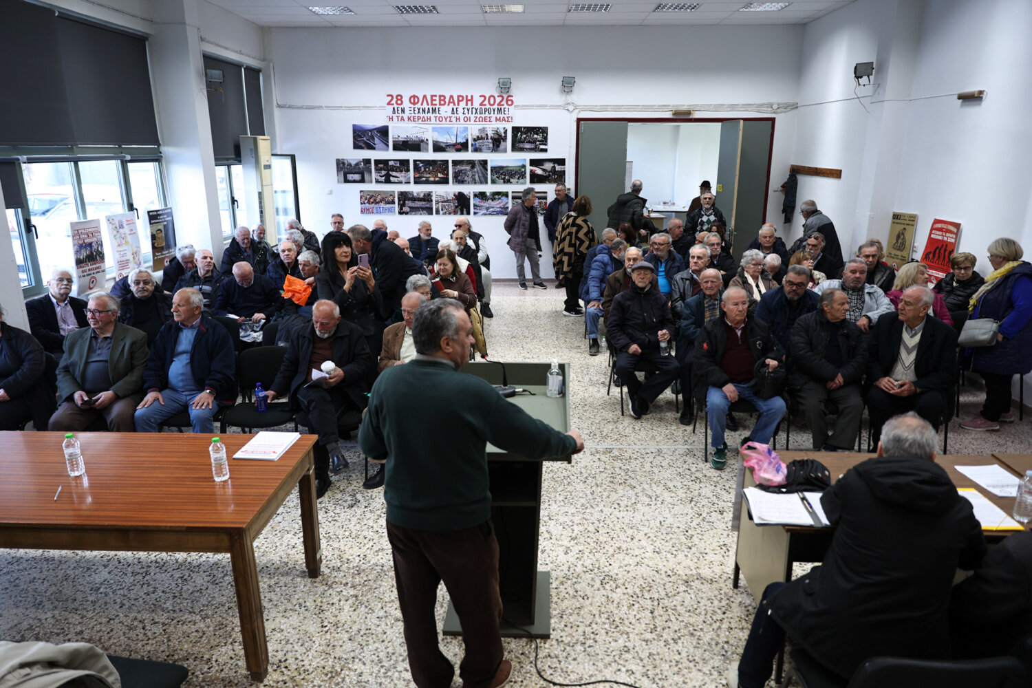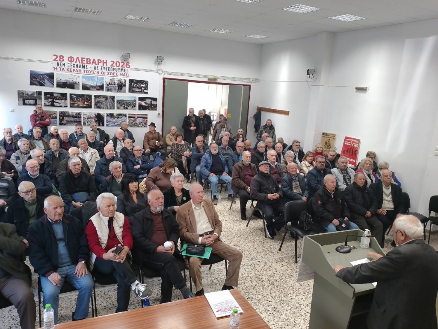 Κεντρικοί ομιλητές ήταν οι Χρ. Κολοβός πρόεδρος Πανελλήνιας Ομοσπονδίας Συνταξιούχων του ΟΑΕΕ και ο Γ. Σκιαδιώτης, αντιπρόεδρος της Ομοσπονδίας Συνταξιούχων ΙΚΑ Ελλάδος. Ακολούθησαν παρεμβάσεις εκπροσώπων των πρωτοβάθμιων σωματείων από όλη τη Θεσσαλία. Κοινός παρονομαστής όλων των ομιλητών ήταν η αποφασιστικότητα για συνέχιση του