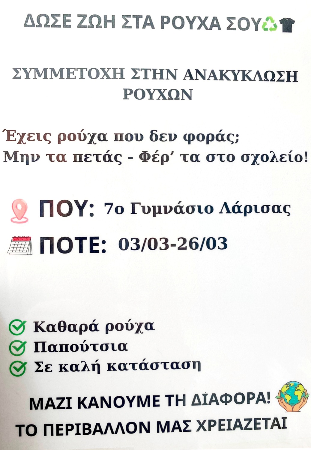«Δώσε ζωή στα ρούχα σου»: Δράση ανακύκλωσης από το 7ο Γυμνάσιο Λάρισας