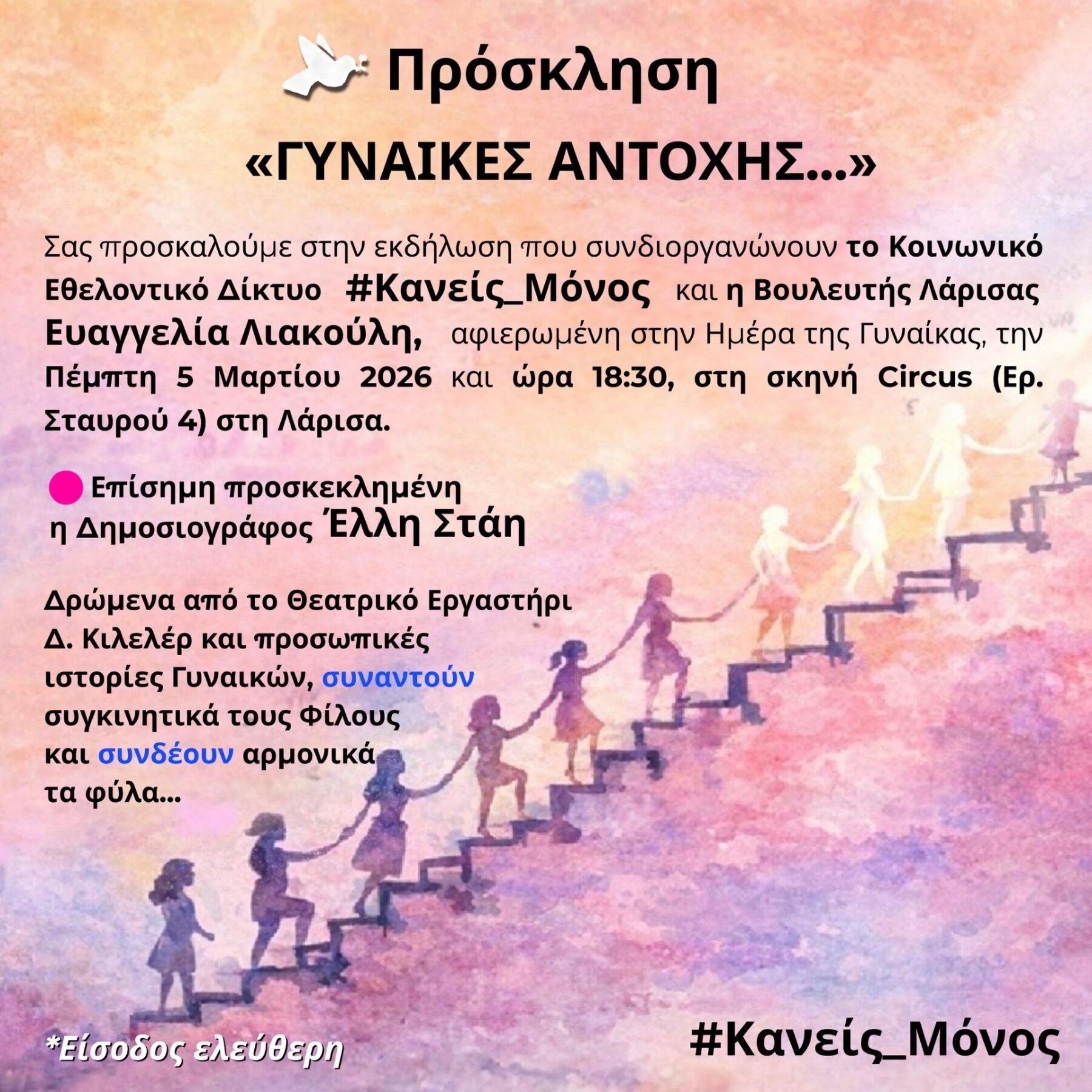 Το Κοινωνικό Εθελοντικό Δίκτυο #Κανείς_Μόνος, σε συνεργασία με την Ευαγγελία Λιακούλη και με επίσημη προσκεκλημένη την γνωστή δημοσιογράφο Έλλη Στάη, διοργανώνει εκδήλωση αφιερωμένη στην Ημέρα της Γυναίκας, την Πέμπτη 5 Μαρτίου 2026, στη Σκηνή Circus στη Λάρισα.