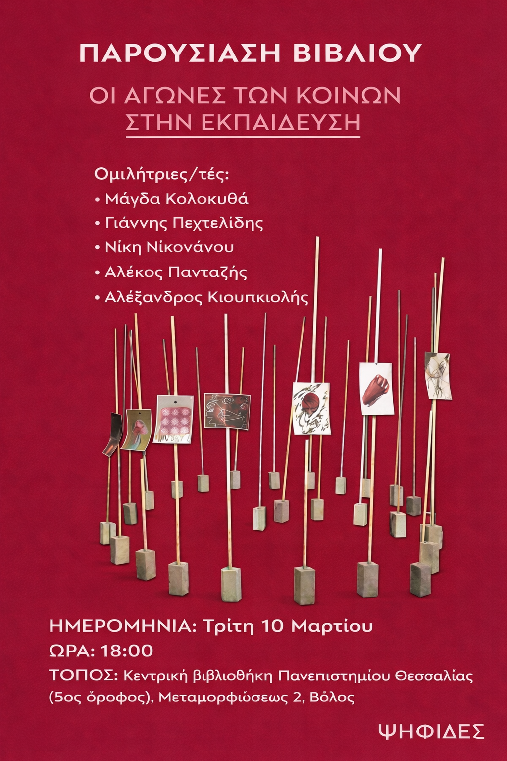 Παρουσίαση του συλλογικού τόμου «Οι Αγώνες των Κοινών στην Εκπαίδευση» θα πραγματοποιηθεί την Τρίτη 10 Μαρτίου, στις 18:00, στην Κεντρική Βιβλιοθήκη του Πανεπιστημίου Θεσσαλίας (5ος όροφος), Μεταμορφώσεως 2, Βόλος.