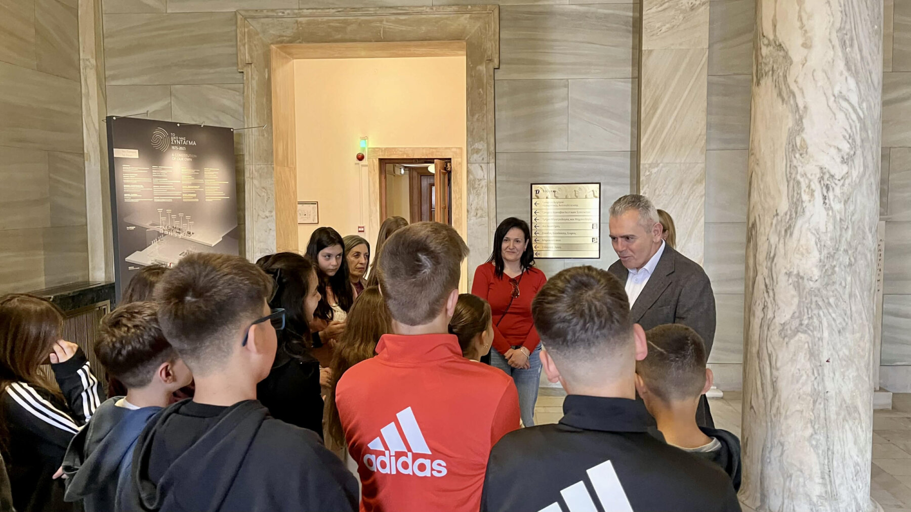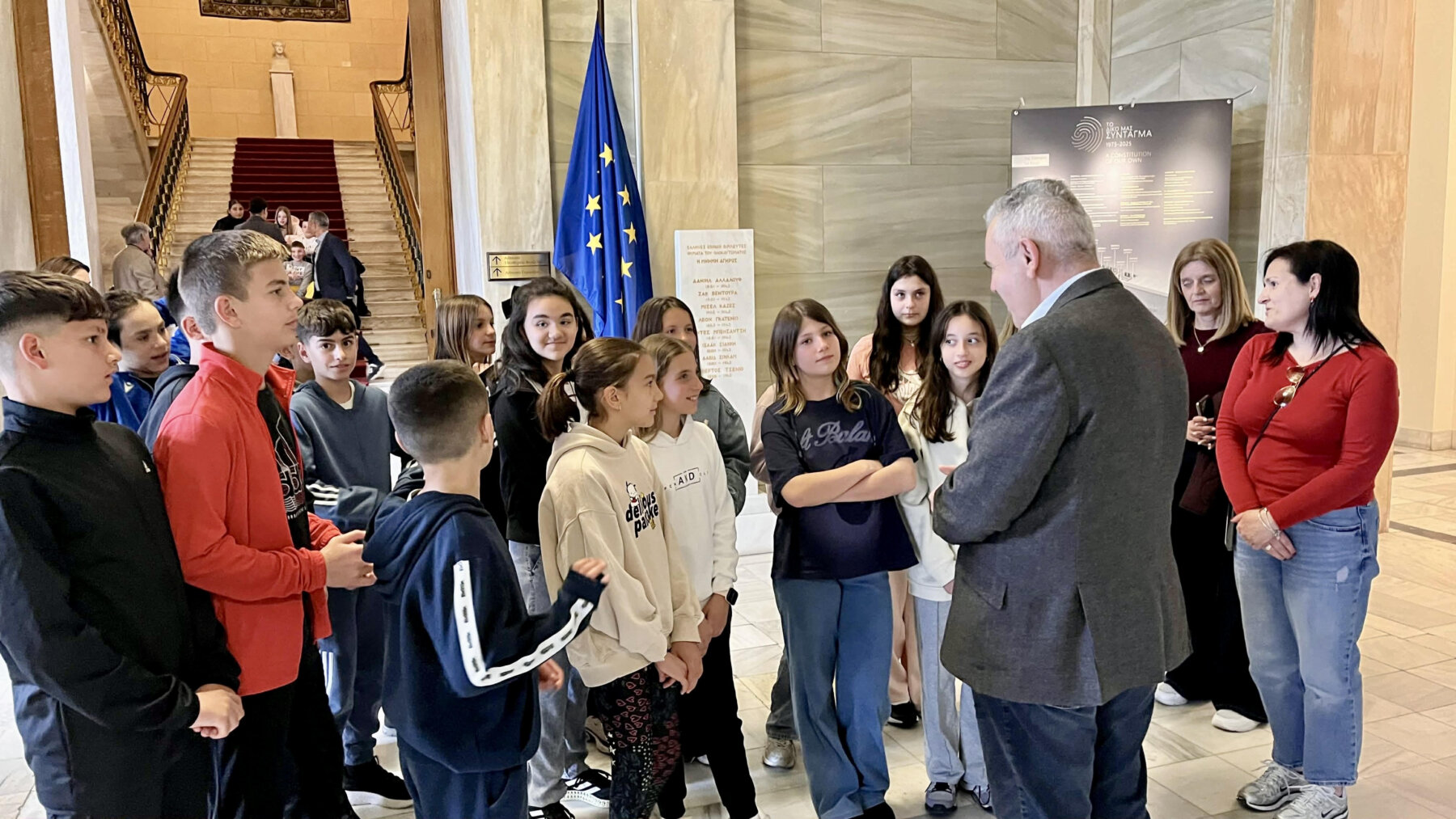 Ο Θεσσαλός πολιτικός εξήγησε στα παιδιά τον τρόπο λειτουργίας της νομοθετικής εξουσίας, ενώ σημείωσε ότι «στη Βουλή θα δείτε επίσης την έκθεση για το Σύνταγμα. Το Σύνταγμα είναι ο βασικός νόμος του κράτους, είναι ο καταστατικός χάρτης που περιγράφει το πολίτευμα, τους κανόνες, τις αρχές που πρέπει να διέπουν το πολίτευμά μας που είναι η Προεδρευόμενη Κοινοβουλευτική Δημοκρατία. Φέτος συμπληρώνονται 51 χρόνια από την ψήφιση του Συντάγματος το 1975, μετά την αποκατάσταση της Δημοκρατίας.