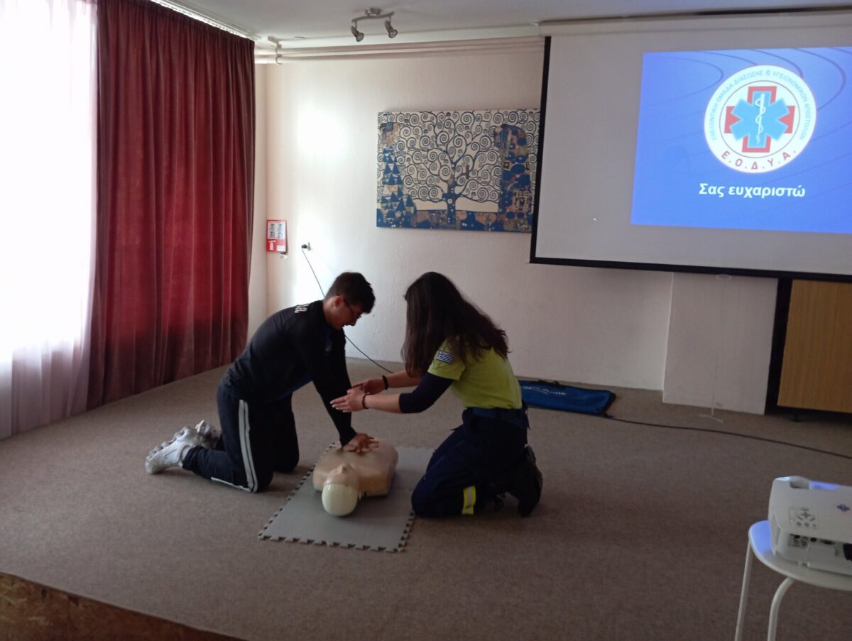 Στο πλαίσιο του μαθήματος της Φυσικής Αγωγής και των δράσεων Ενεργού Πολίτη, πραγματοποιήθηκε στο σχολείο μας ενημερωτική δράση με θέμα τις Πρώτες Βοήθειες, από την Εθελοντική Ομάδα Διάσωσης και Υγειονομικών Αποστολών (ΕΟΔΥΑ) Λάρισας.