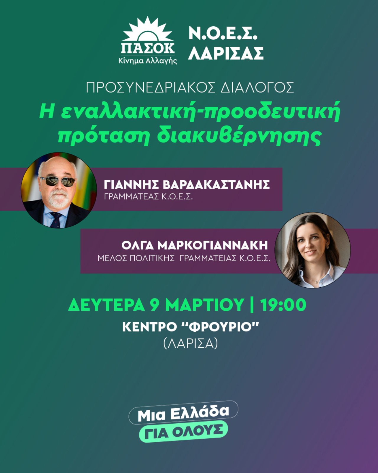 Η Ν.Ο.Ε.Σ. Λάρισας του ΠΑΣΟΚ – Κινήματος Αλλαγής διοργανώνει τη μεγάλη προσυνεδριακή εκδήλωση διαλόγου, με θέμα: «Η εναλλακτική – προοδευτική πρόταση διακυβέρνησης»