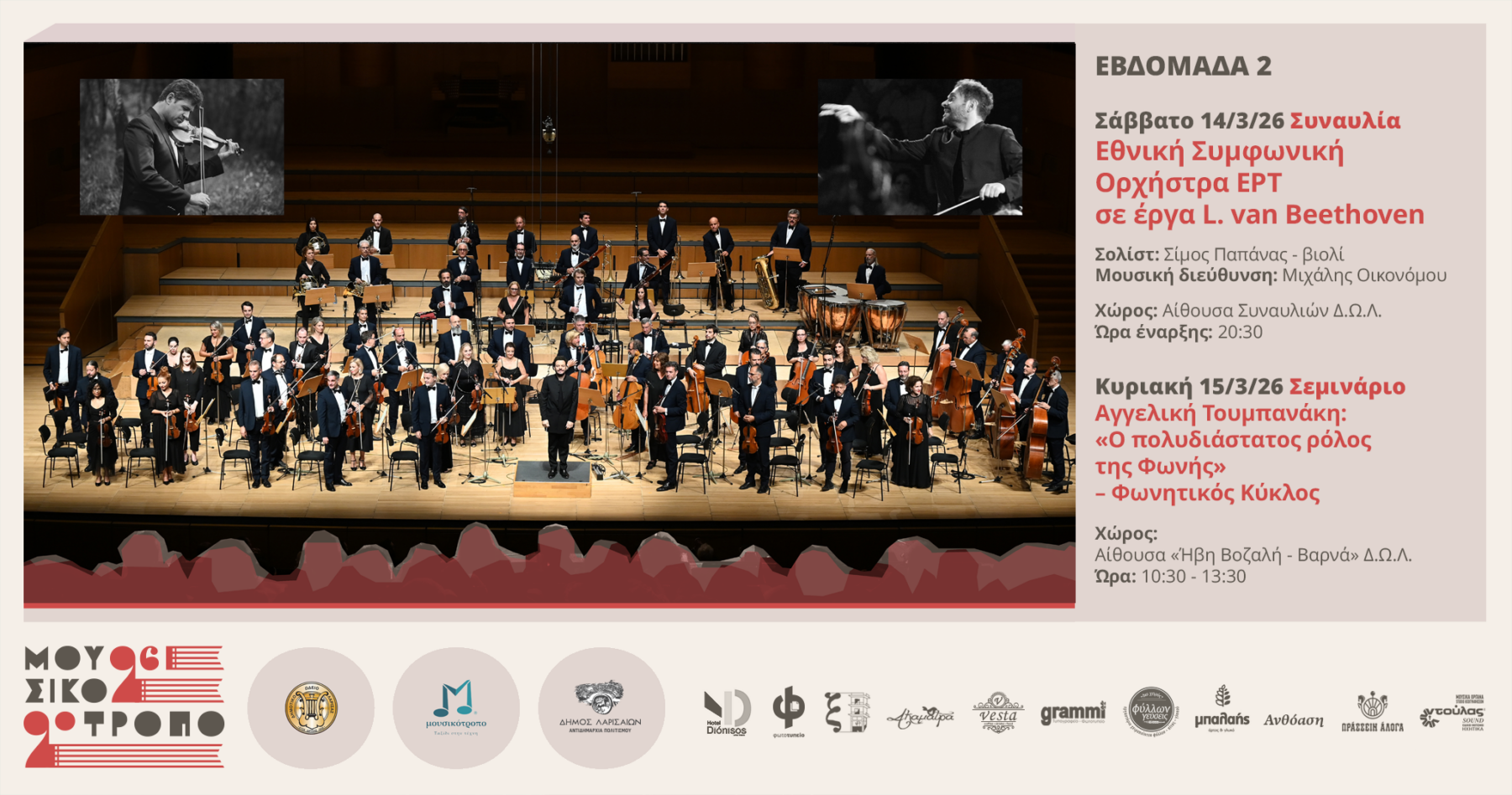 Μια από τις σημαντικότερες μουσικές στιγμές του φετινού Φεστιβάλ Μουσικότροπο έρχεται, όταν η Εθνική Συμφωνική Ορχήστρα της ΕΡΤ εμφανίζεται στη Λάρισα με ένα πρόγραμμα αφιερωμένο σε δύο από τα πιο αγαπημένα και εμβληματικά έργα του Ludwig van Beethoven, το Σάββατο 14 Μαρτίου 2026, στις 20:30, στην αίθουσα Συναυλιών του Δημοτικού Ωδείου Λάρισας.