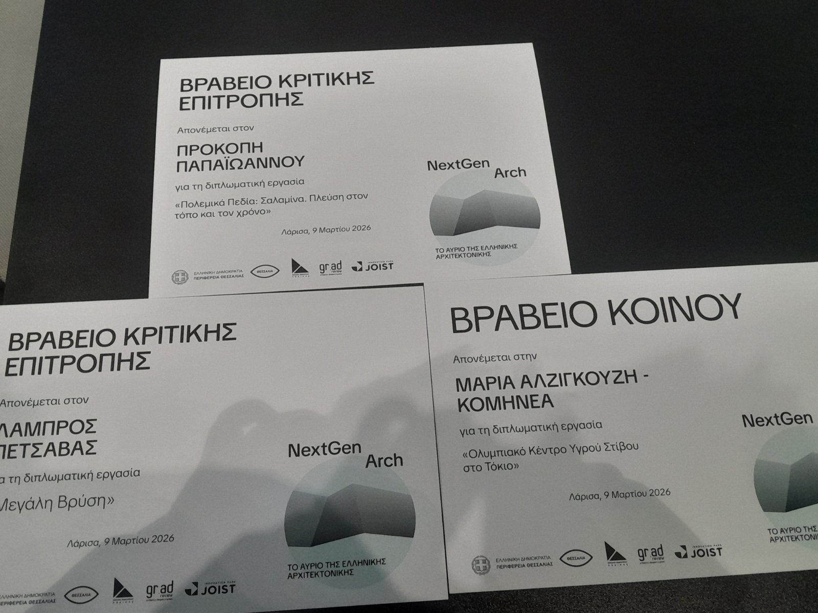 Πρόσωπα του αρχιτεκτονικού χώρου έδωσαν το παρόν στην τελετή απονομής των βραβείων «NextGen Arch: Το αύριο της ελληνικής αρχιτεκτονικής» η οποία διοργανώθηκε από την Περιφέρεια Θεσσαλίας και πραγματοποιήθηκε σήμερα Δευτέρα 9 Μαρτίου 2026 και ώρα 19:00, στο Πάρκο Καινοτομίας JOIST στη Λάρισα.