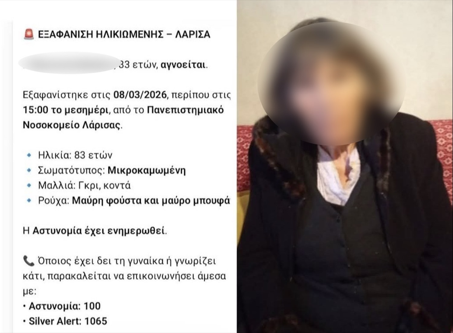 Θετική έκβαση είχε η υπόθεση εξαφάνισης μιας ηλικιωμένης γυναίκας από το Πανεπιστημιακό Νοσοκομείο Λάρισας.