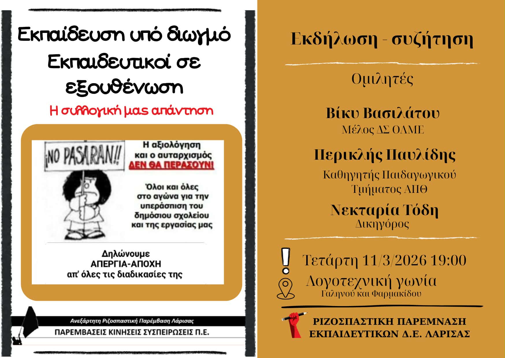 Η Ανεξάρτητη Ριζοσπαστική Παρέμβαση και η Ριζοσπαστική Παρέμβαση Εκπαιδευτικών Δ.Ε. Λάρισας διοργανώνουν εκδήλωση – συζήτηση με τίτλο «Εκπαίδευση υπό διωγμό – Εκπαιδευτικοί σε εξουθένωση: Η συλλογική μας απάντηση», την Τετάρτη 11 Μαρτίου 2026 στις 19:00, στη Λογοτεχνική Γωνία Λάρισας (Γαληνού & Φαρμακίδου).