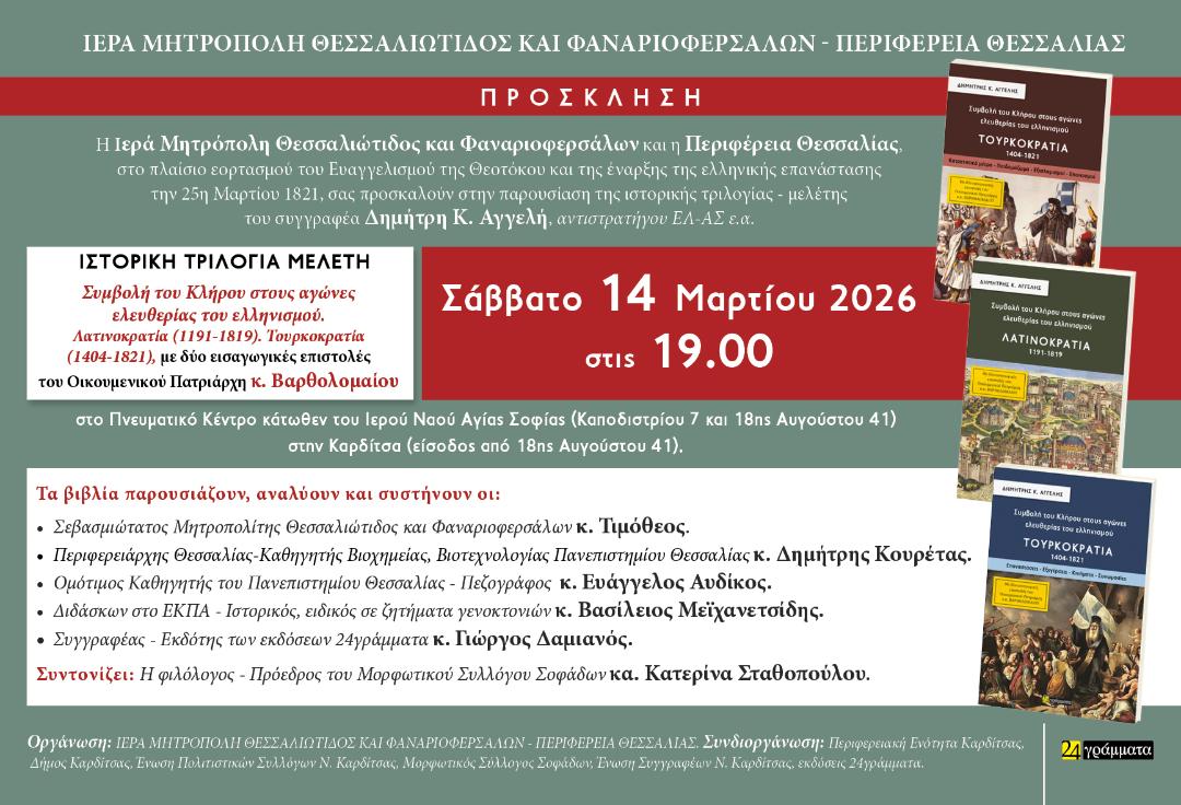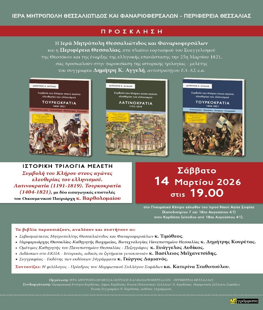 Η ιστορική αυτή τριλογία – μελέτη (416+538+678=1632 σελίδες) προγραμματίστηκε να πρωτοπαρουσιασθεί στην Καρδίτσα, προσωπικά από τον Σεβασμιώτατο Μητροπολίτη της Ιεράς Μητροπόλεως Θεσσαλιώτιδος και Φαναριοφερσάλων κ. Τιμόθεο, τον Περιφερειάρχη Θεσσαλίας – Καθηγητή Βιοχημείας, Βιοτεχνολογίας του Πανεπιστημίου Θεσσαλίας κ. Δημήτριο Κουρέτα, τον Ομότιμο Καθηγητή του Τμήματος Ιστορίας, Αρχαιολογίας και Κοινωνικής Ανθρωπολογίας του Πανεπιστημίου Θεσσαλίας – Πεζογράφο κ. Ευάγγελο Αυδίκο και τον Διδάσκοντα στο Ε.Κ.Π.Α. – Ιστορικό, ειδικό σε ζητήματα γενοκτονιών – Υπεύθυνο Διεθνούς Συνεργασίας της «Αποστολής» της Ιεράς Αρχιεπισκοπής Αθηνών Δρ. Βασίλειο Μεϊχανετσίδη, το Σάββατο 14η Μαρτίου 2026, ώρα 19.00 στο Πνευματικό Κέντρο κάτωθεν του Ιερού Ναού Αγίας Σοφίας (Καποδιστρίου 7 και 18ης Αυγούστου 41) της Ιεράς Μητροπόλεως Θεσσαλιώτιδος και Φαναριοφερσάλων στην Καρδίτσα, στο πλαίσιο της ταυτόχρονης διπλής μεγάλης θρησκευτικής και εθνικής εορτής του Ευαγγελισμού της Θεοτόκου και της έναρξης της ελληνικής επανάστασης την 25η Μαρτίου 1821. Συντονίζει η φιλόλογος – Πρόεδρος του Μορφωτικού Συλλόγου Σοφάδων κα. Κατερίνα Σταθοπούλου.