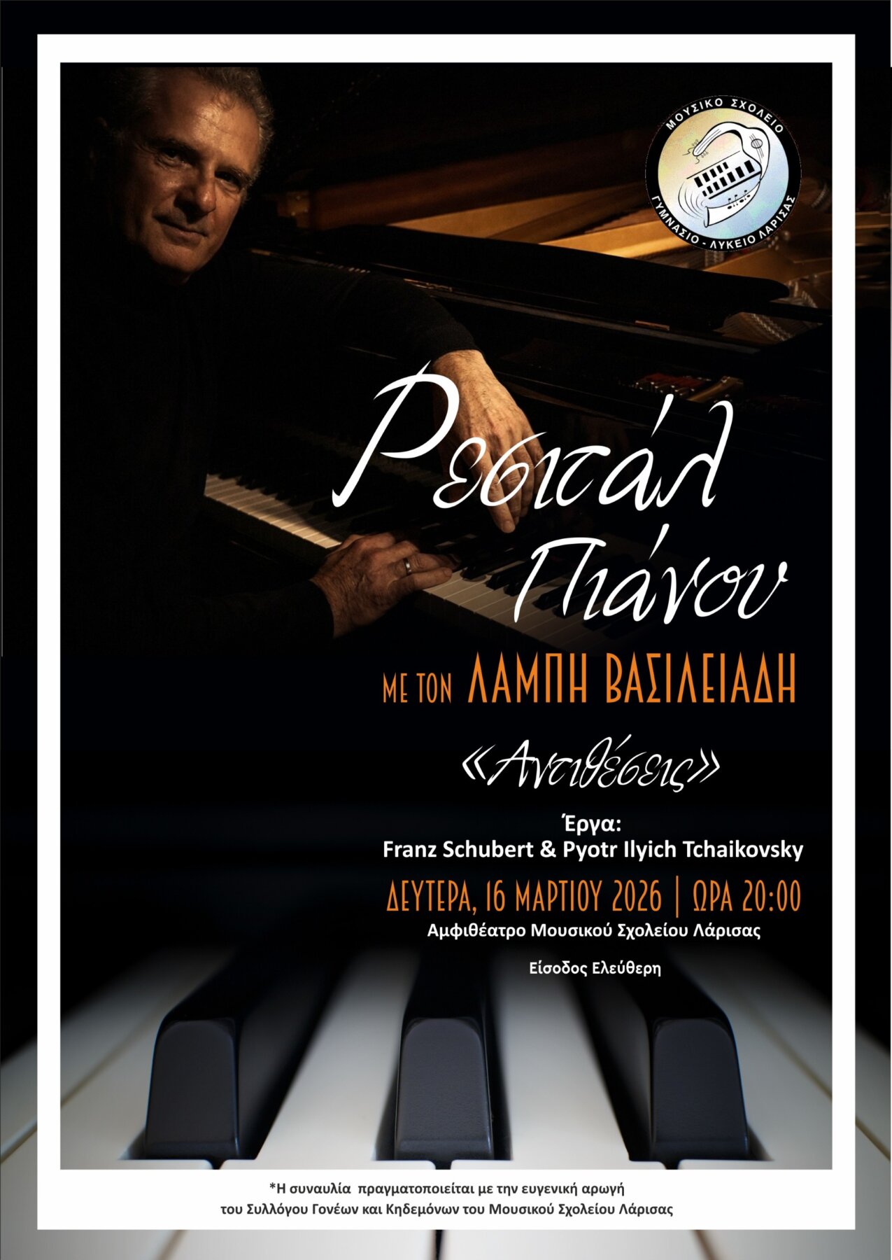 Δευτέρα 16 Μαρτίου 2026 ||20:00 Ρεσιτάλ πιάνου του κ. Λάμπη Βασιλειάδη στο Αμφιθέατρο του Μουσικού Σχολείου Λάρισας, με ελεύθερη είσοδο για το κοινό.