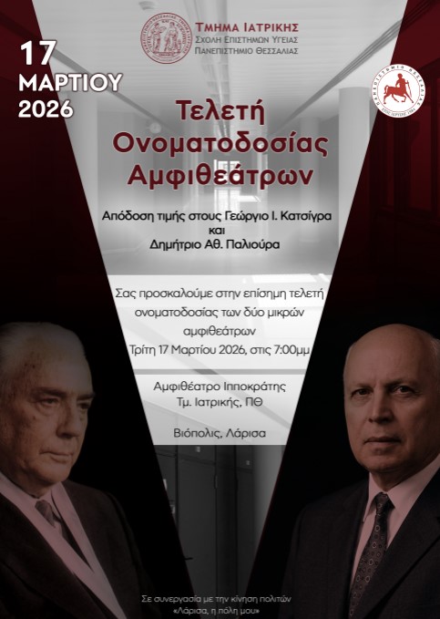 Ο Πρόεδρος του Τμήματος Ιατρικής του Πανεπιστημίου Θεσσαλίας σάς προσκαλεί στην επίσημη τελετή ονοματοδοσίας των δύο μικρών αμφιθεάτρων, η οποία θα πραγματοποιηθεί την Τρίτη 17 Μαρτίου 2026 και ώρα 19:00 στο μεγάλο αμφιθέατρο «Ιπποκράτης» του Τμήματος Ιατρικής στη Βιόπολη της Λάρισας.