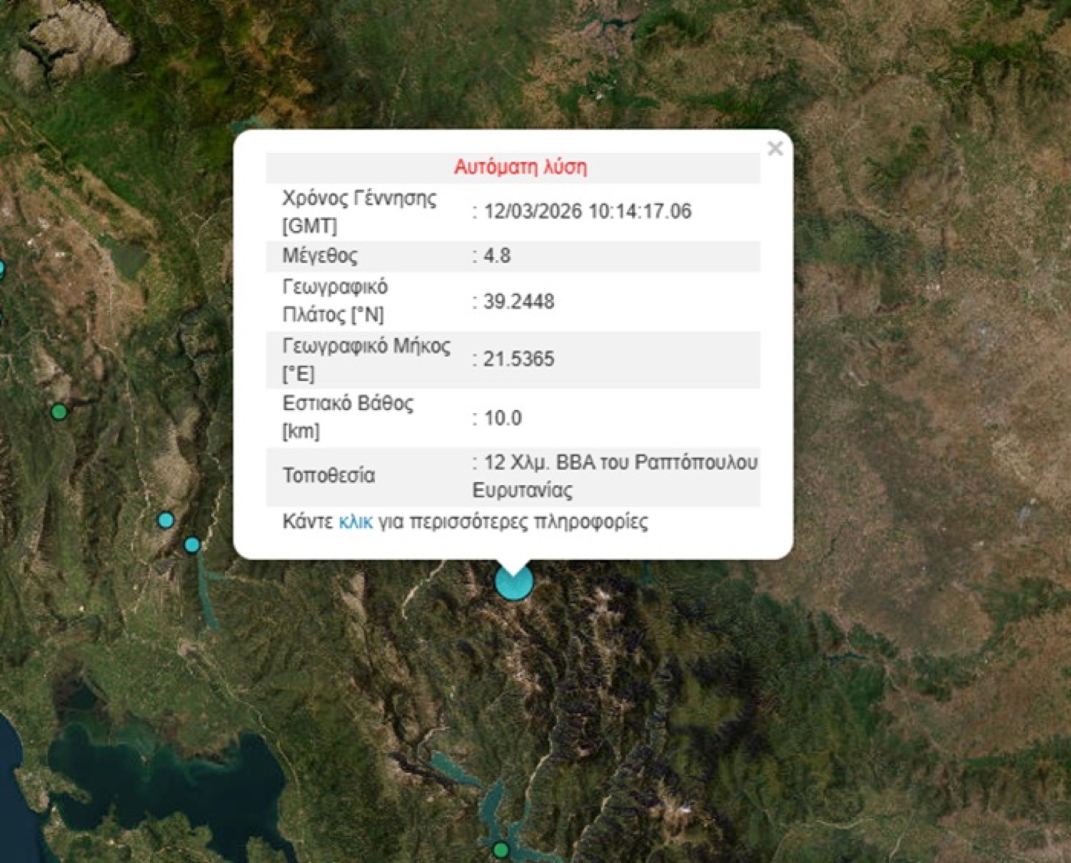 Επίσης, στο parapolitika.gr δήλωσε, σύμφωνα με την πρώτη εκτίμηση: «Στις 12:14 σημειώθηκε σεισμός 4,8 βαθμών της κλίμακας Ρίχτερ στην ευρύτερη περιοχή της Καρδίτσας, κοντά στο χωριό Στεφανιάδα». Ειδικότερα, το επίκεντρο εντοπίζεται 11 χιλιόμετρα βορειοανατολικά του Ραπτόπουλου Ευρυτανίας, ενώ η σεισμική δόνηση έγινε αισθητή στην ευρύτερη περιοχή της Θεσσαλίας, στην Ευρυτανία και στην Άρτα. «Ο σεισμός έγινε αισθητός από τη Λευκάδα μέχρι τον Βόλο», ανέφερε χαρακτηριστικά.