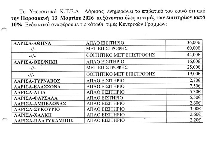 Το Υπεραστικό ΚΤΕΛ Λάρισας με ανακοίνωσή του ενημερώνει τους πολίτες για τις αυξήσεις των εισιτηρίων σε όλα τα δρομολόγια και η οποία θα ισχύει από Παρασκευή 13 Μαρτίου.