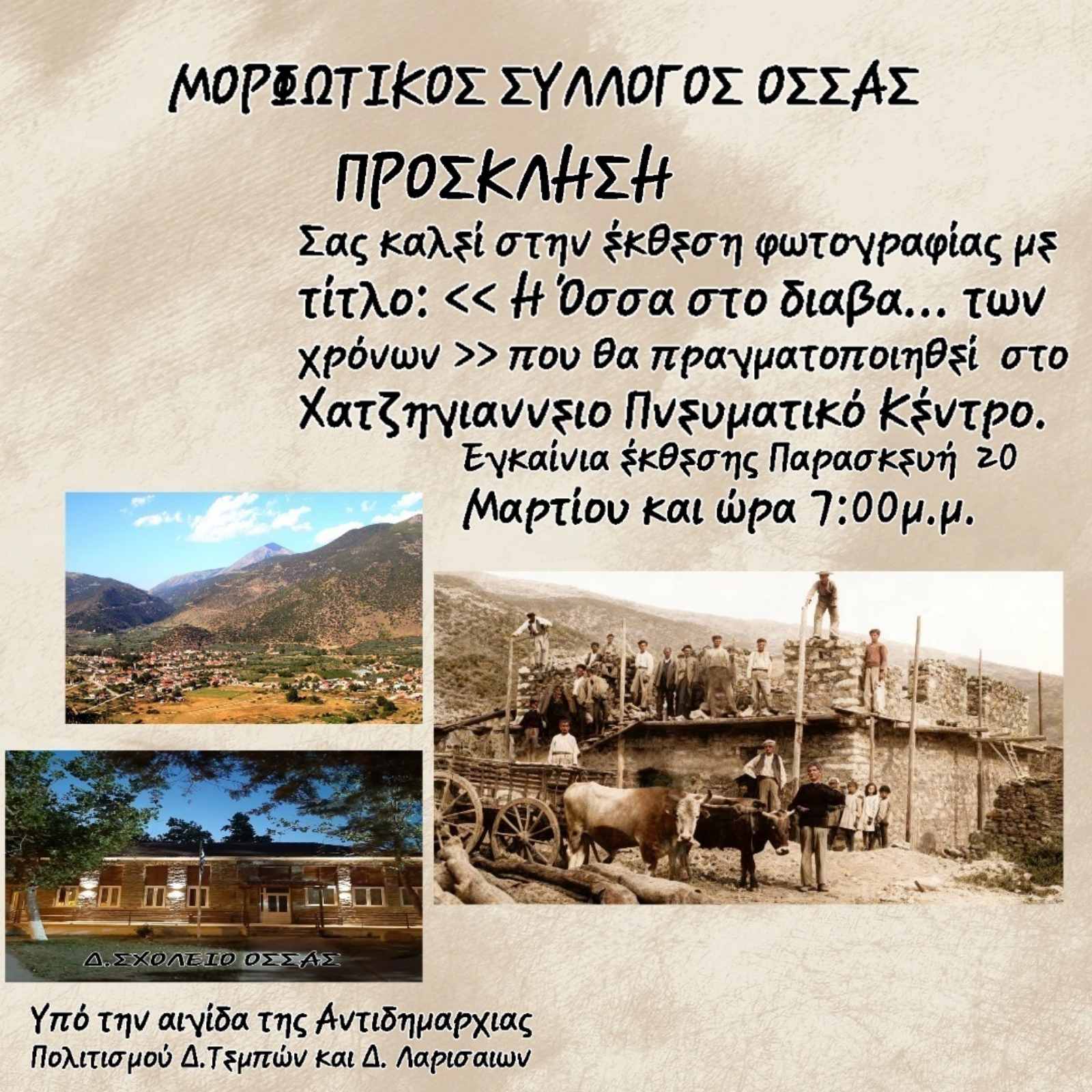 Ο Δήμος Τεμπών και η Αντιδημαρχία Πολιτισμού στηρίζουν και θέτουν υπό την αιγίδα τους την έκθεση φωτογραφίας με τίτλο «Η Όσσα στο διάβα… των χρόνων», που διοργανώνει ο Μορφωτικός Σύλλογος Όσσας.