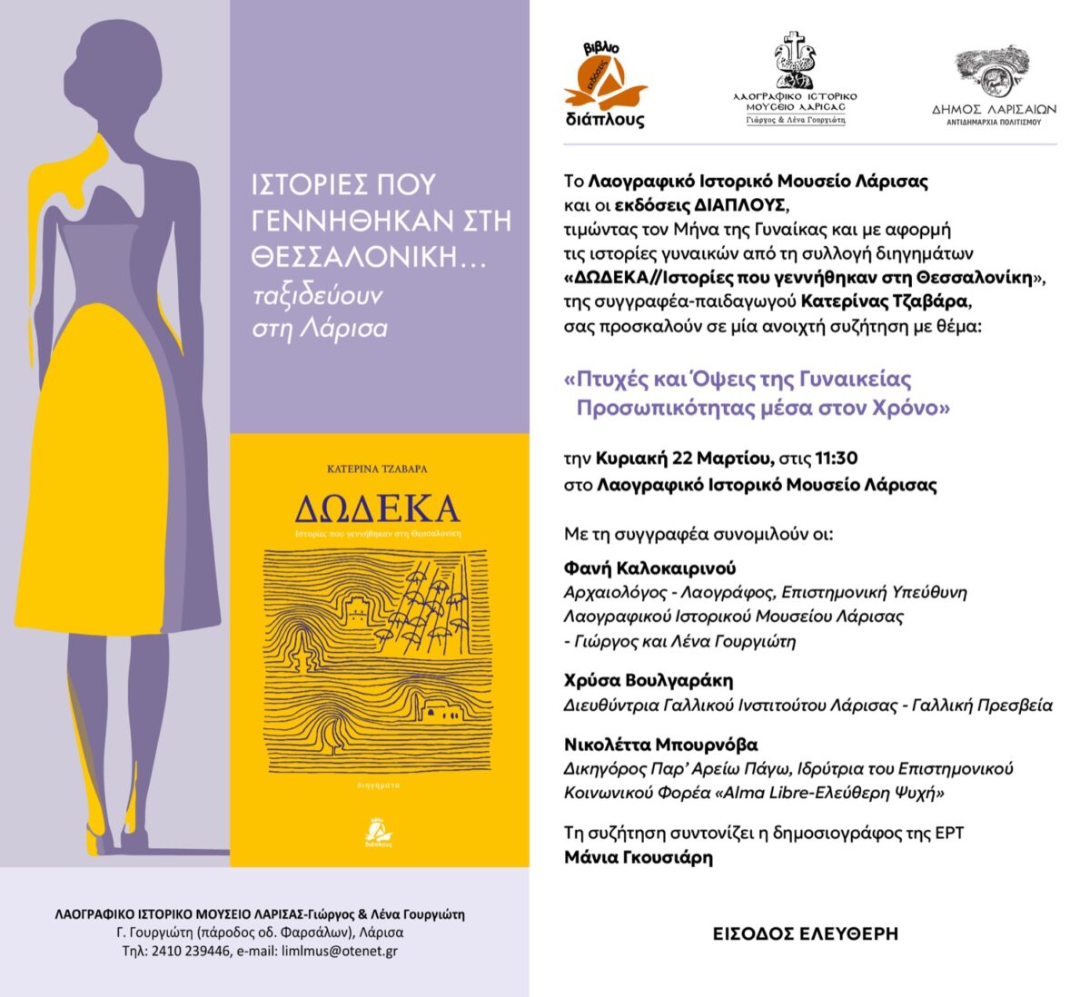 Με αφορμή το βιβλίο της Κατερίνας Τζαβάρα «Δώδεκα. Ιστορίες που γεννήθηκαν στη Θεσσαλονίκη», το Μουσείο και οι εκδόσεις Διάπλους διοργανώνουν μια ανοιχτή συζήτηση με θέμα «Πτυχές και Όψεις της Γυναικείας Προσωπικότητας μέσα στον Χρόνο», την Κυριακή 22 Μαρτίου, στις 11:30, στο Λαογραφικό Ιστορικό Μουσείο Λάρισας (Γ. Γουργιώτη, Πάροδος οδού Φαρσάλων).