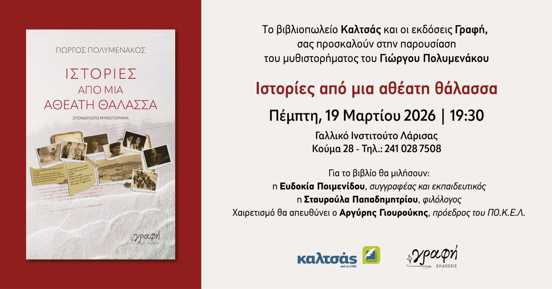 Την Πέμπτη 19 Μαρτίου 2026 και ώρα 19:30 θα πραγματοποιηθεί στη Λάρισα η παρουσίαση του βιβλίου «Ιστορίες από μια αθέατη θάλασσα» (Εκδόσεις Γραφή), του συγγραφέα Γιώργου Πολυμενάκου, στο Γαλλικό Ινστιτούτο Λάρισας.