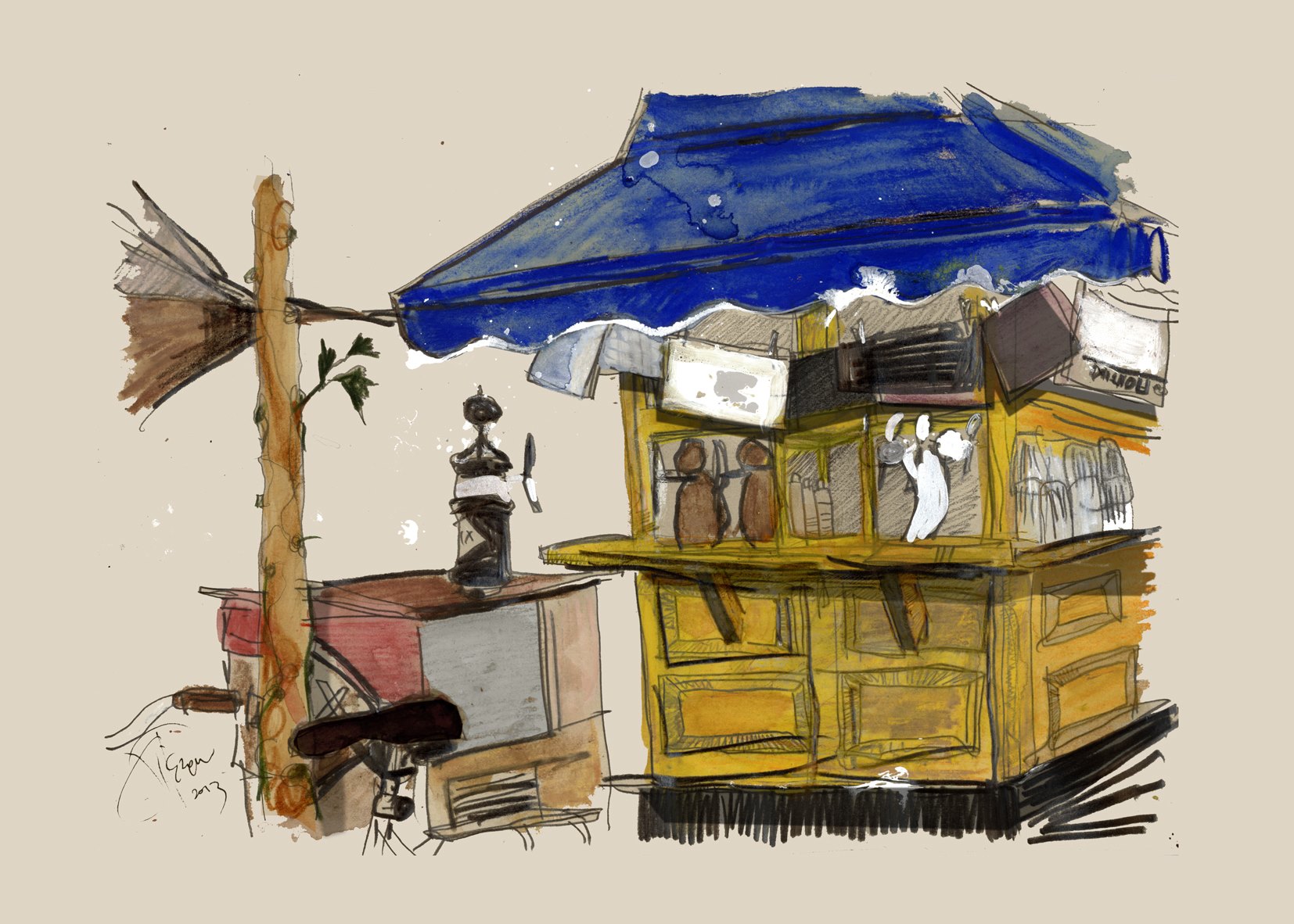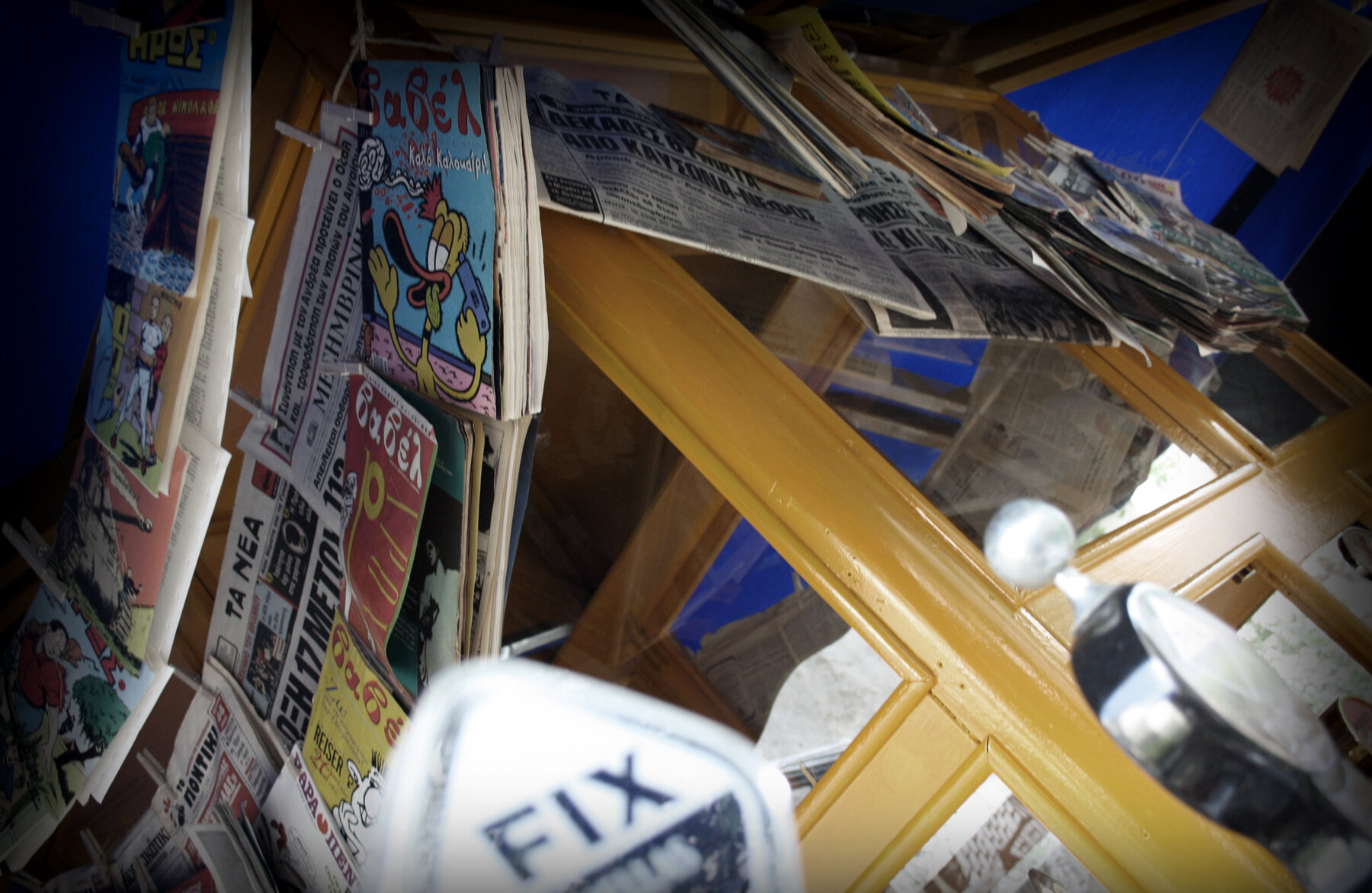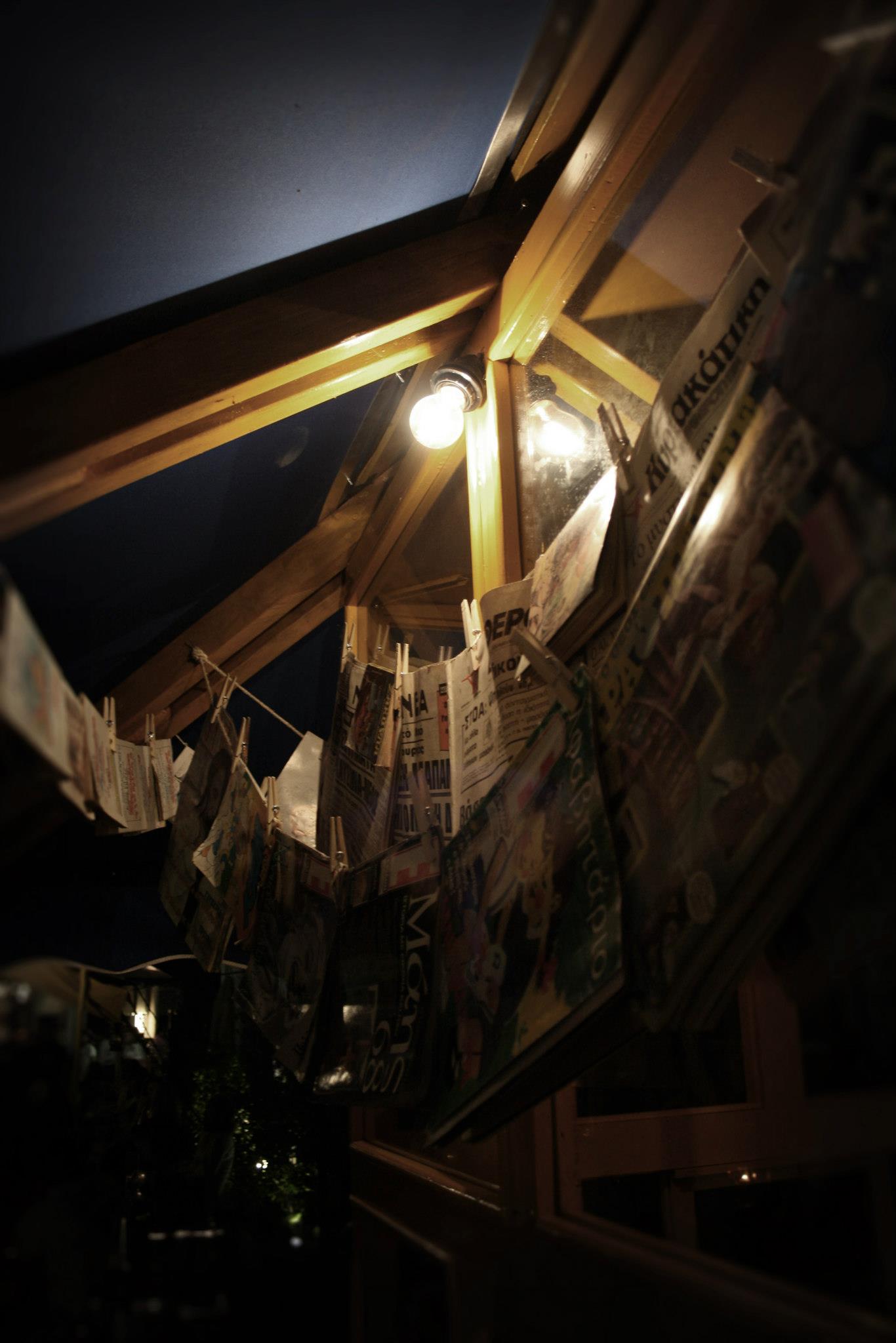 Μπορεί να ήταν το μισό μέσα στο νερό αλλά δεν ήταν διαλυμένο. Το έτριψαν και το ξαναβάψανε κίτρινο, παρήγγειλαν νέες τέντες «στο μπλε του κοβαλτίου», πήραν μέτρα και τοποθέτησαν νέα τζάμια στα παράθυρα. Κατέβηκαν Αθήνα και αγόρασαν από το Μοναστηράκι εφημερίδες και περιοδικά παλιά. Του ΄60, του ΄70 και μετά. Είχαν μια εφημερίδα «Μεσημβρινή» με πρωτοσέλιδο τον Παπανδρέου πριν από το 1981. Κάποιες Βαβέλ, ένα Αλφαβητάρι, μια Ελευθεροτυπία με το παλιό της λογότυπο της δεκαετίας του ΄70, ένα ασπρόμαυρο φύλλο από Τα Νέα… Δίπλα είχαν τοποθετήσει ένα τροχήλατο για μπύρα και είχαν φτιάξει με ξύλα ανάγλυφη την παλιά επιγραφή της «Φιξ».