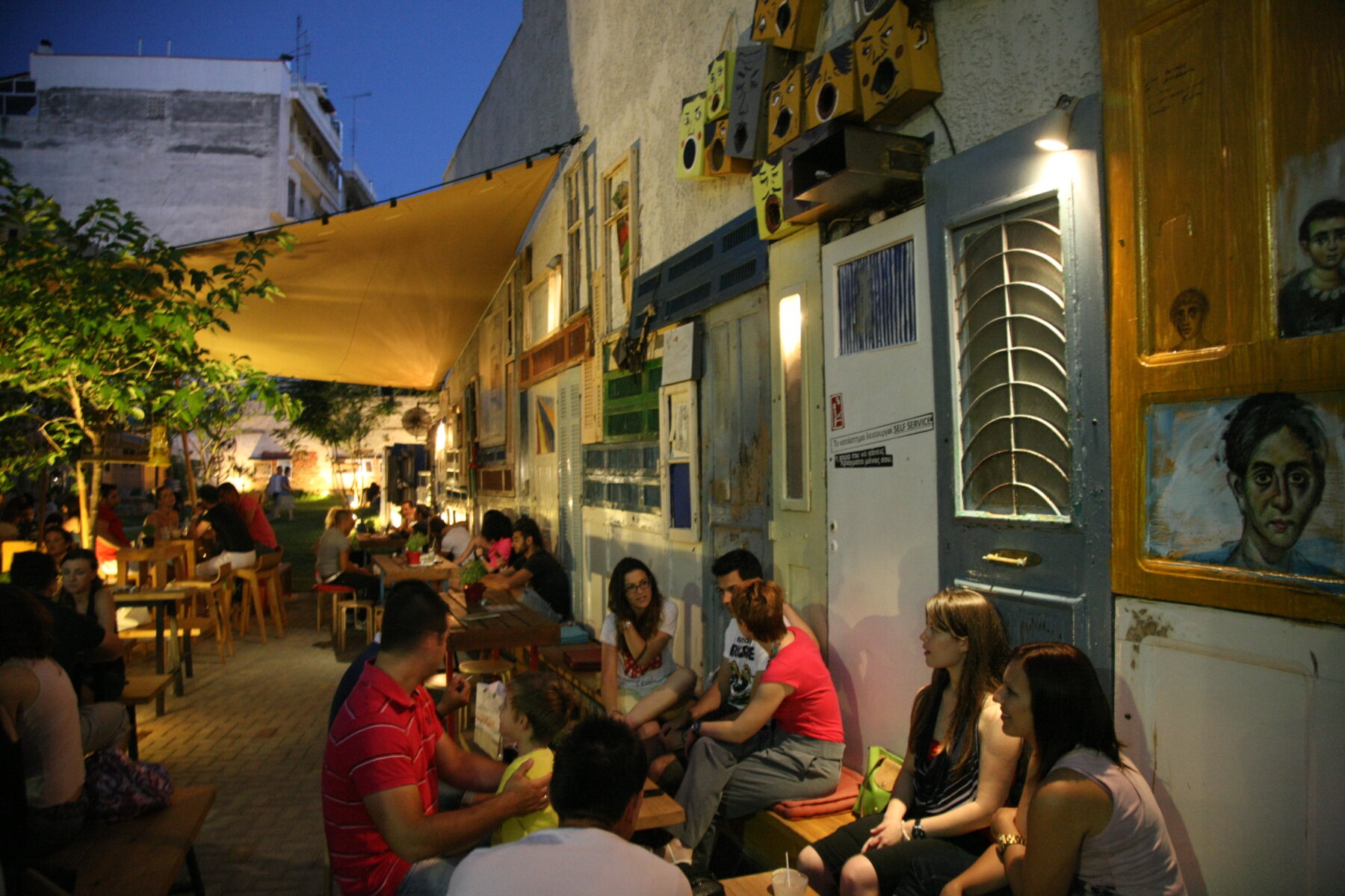 Στα δέντρα ήταν κρεμασμένα αληθινά, βίνταζ, ξύλινα και μεταλλικά κλουβιά πουλιών. Υπήρχαν λαμπιόνια κρεμασμένα στα δέντρα. Τα βράδια κάνανε προβολές στον τοίχο της διπλανής πολυκατοικίας. Αρχίσανε να κάνουνε εκθέσεις. Η πρώτη ήταν φωτογραφίας.