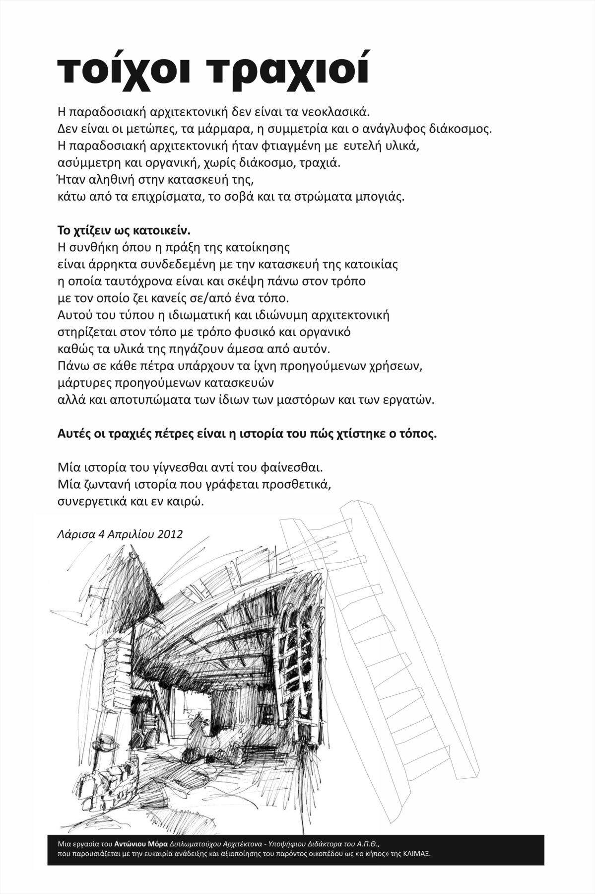 «Η παραδοσιακή αρχιτεκτονική δεν είναι τα νεοκλασικά. Δεν είναι οι μετώπες, τα μάρμαρα, η συμμετρία και ο ανάγλυφος διάκοσμος. Η παραδοσιακή αρχιτεκτονική ήταν φτιαγμένη με ευτελή υλικά, ασύμμετρη και οργανική, χωρίς διάκοσμο, τραχιά. Ήταν αληθινή στην κατασκευή της, κάτω από τα επιχρίσματα, το σοβά και τα στρώματα μπογιάς. Το χτίζειν ως κατοικείν. Η συνθήκη όπου η πράξη της κατοίκησης είναι άρρηκτα συνδεδεμένη με την κατασκευή της κατοικίας η οποία ταυτόχρονα είναι και σκέψη πάνω στον τρόπο με τον οποίο ζει κανείς σε/από έναν τόπο. Αυτού του τύπου η ιδιωματική και ιδιότυπη αρχιτεκτονική στηρίζεται στον τόπο με τρόπο φυσικό και οργανικό καθώς τα υλικά της πηγάζουν άμεσα από αυτόν. Πάνω σε κάθε πέτρα υπάρχουν τα ίχνη προηγούμενων χρήσεων, μάρτυρες προηγούμενων κατασκευών, αλλά και αποτυπώματα των ίδιων των μαστόρων και των εργατών. Αυτές οι τραχιές πέτρες είναι η ιστορία του πώς χτίστηκε ο τόπος. Μία ιστορία του γίγνεσθαι αντί του φαίνεσθαι. Μία ζωντανή ιστορία που γράφεται προσθετικά, συνεργετικά και εν καιρώ».