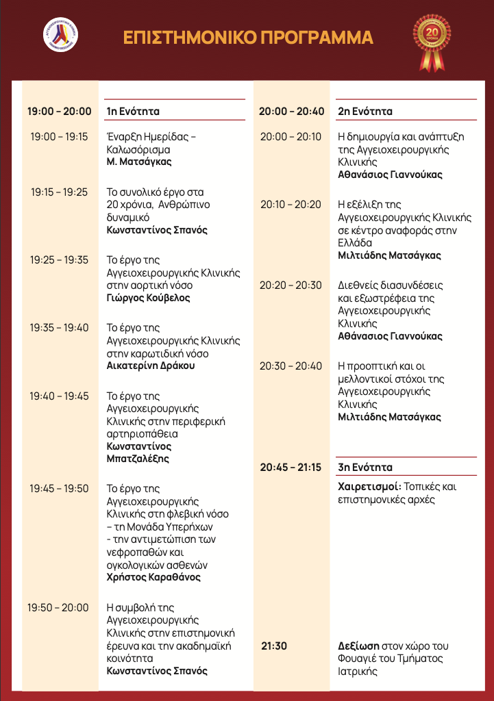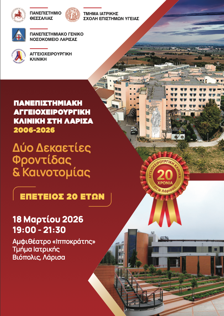 Στο πλαίσιο του εορτασμού για τη συμπλήρωση των 20 ετών λειτουργίας της Πανεπιστημιακής Αγγειοχειρουργικής Κλινικής στο Π.Γ.Ν. Λάρισας, διοργανώνεται Επετειακή Εκδήλωση αύριο, Τετάρτη 18 Μαρτίου 2026 και ώρα 19:00-21:30, στο Αμφιθέατρο «Ιπποκράτης» του Τμήματος Ιατρικής, στην Βιόπολη της Λάρισας όπου θα ανακοινωθούν τα πεπραγμένα της Κλινικής αλλά και οι προοπτικές συνέχισης του έργου της για την επόμενη δεκαετία.