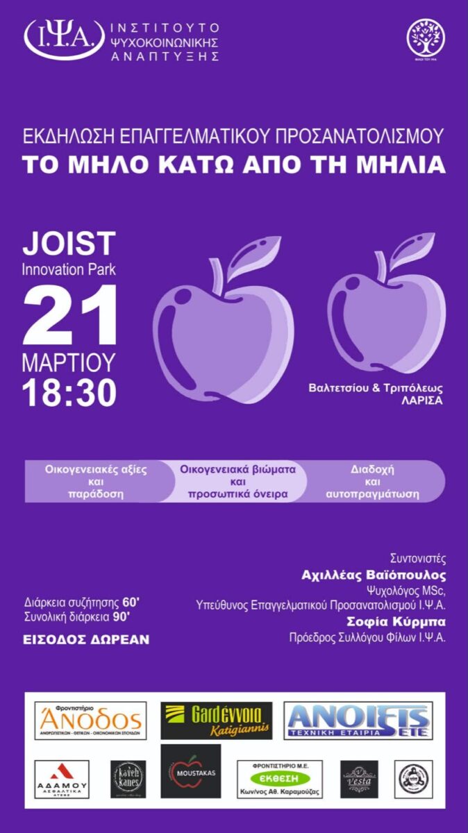 Το Ινστιτούτο Ψυχοκοινωνικής Ανάπτυξης (Ι.Ψ.Α.) και ο Σύλλογος «Φίλοι του Ι.Ψ.Α.» ανακοινώνουν τη διοργάνωση εκδήλωσης- συζήτησης για τον Επαγγελματικό Προσανατολισμό και την αναζήτηση επαγγέλματος με τίτλο: «Το μήλο κάτω από τη μηλιά» Οικογενειακές αξίες και παράδοση- Οικογενειακά βιώματα και προσωπικά όνειρα- Διαδοχή και αυτοπραγμάτωση¨ το Σάββατο, 21 Μαρτίου 2026, στις 18:30,