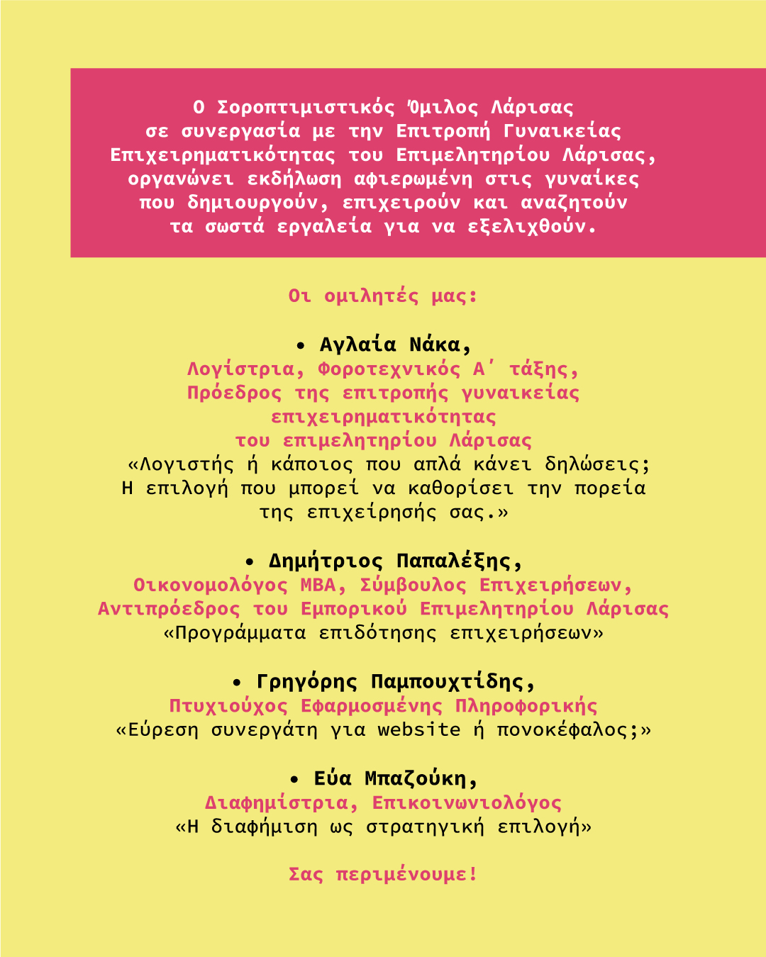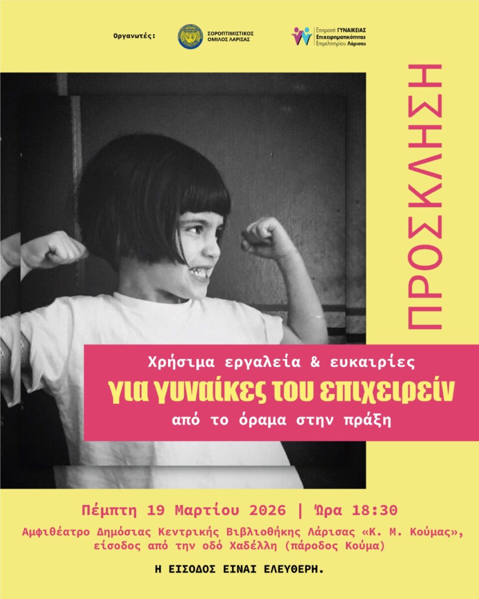Ο Σοροπτιμιστικός Όμιλος Λάρισας, σε συνεργασία με την Επιτροπή Γυναικείας Επιχειρηματικότητας του Επιμελητηρίου Λάρισας, διοργανώνει ενημερωτική εκδήλωση με θέμα: