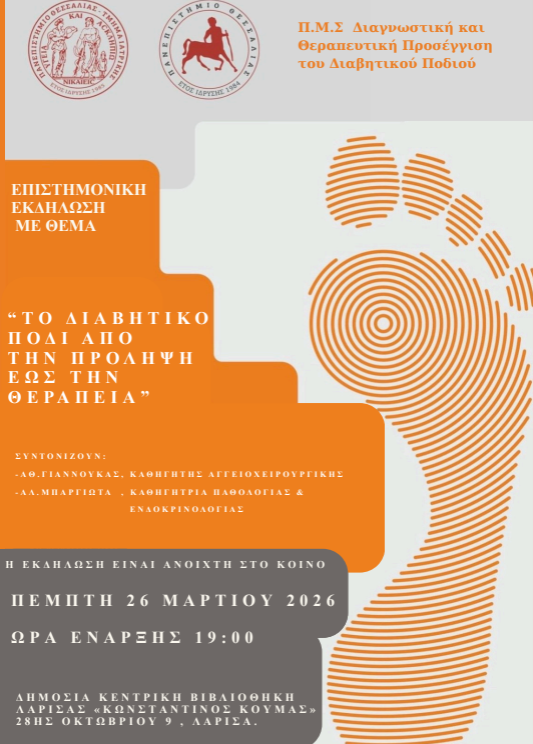 Την Πέμπτη 26 Μαρτίου 2026, από τις 19:00 έως τις 20:30, θα πραγματοποιηθεί στην αίθουσα εκδηλώσεων της Δημόσιας Βιβλιοθήκης Λάρισας «Κωνσταντίνος Κούμας» επιστημονική εκδήλωση με τίτλο «Διαβητικό πόδι: Από την πρόληψη έως τη θεραπεία».