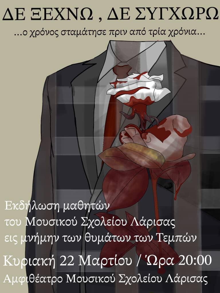 «Ο Σύλλογος Γονέων και Κηδεμόνων του Μουσικού Σχολείου Λάρισας καλεί τα μέλη του και την τοπική κοινωνία να παρευρεθούν στην εκδήλωση των μαθητών του σχολείου, εις μνήμην των θυμάτων των Τεμπών, στην οποία θα συμμετάσχουν η κα Χλωρού Χρυσούλα και η κα Λάτα Άλμα, μαζί με άλλους συγγενείς των θυμάτων και των οικογενειών τους.