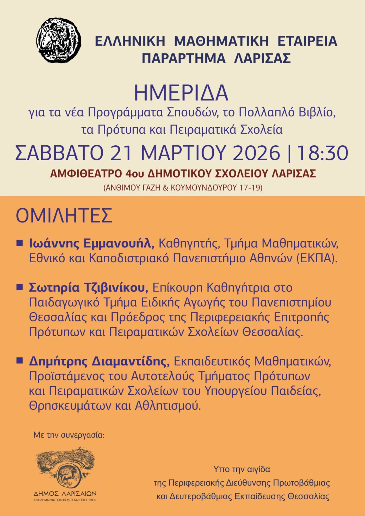 Το Παράρτημα Λάρισας της Ελληνικής Μαθηματικής Εταιρείας, σε συνεργασία με την Αντιδημαρχία Πολιτισμού του Δήμου Λαρισαίων και υπό την αιγίδα της Περιφερειακής Διεύθυνσης Πρωτοβάθμιας και Δευτεροβάθμιας Εκπαίδευσης Θεσσαλίας, διοργανώνει επιστημονική ημερίδα το Σάββατο 21 Μαρτίου 2026 στο αμφιθέατρο του 4ου Δημοτικού Σχολείου Λάρισας.
