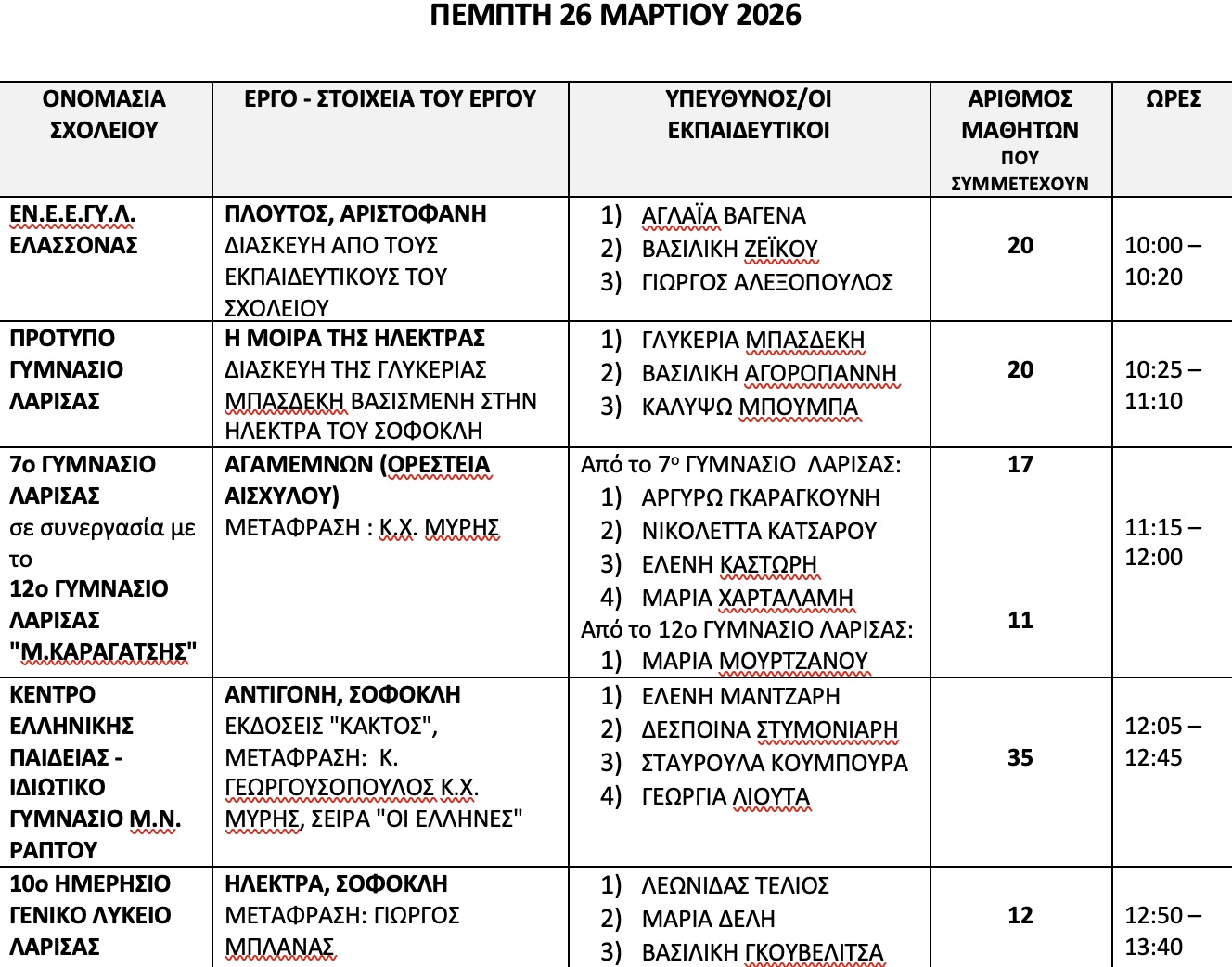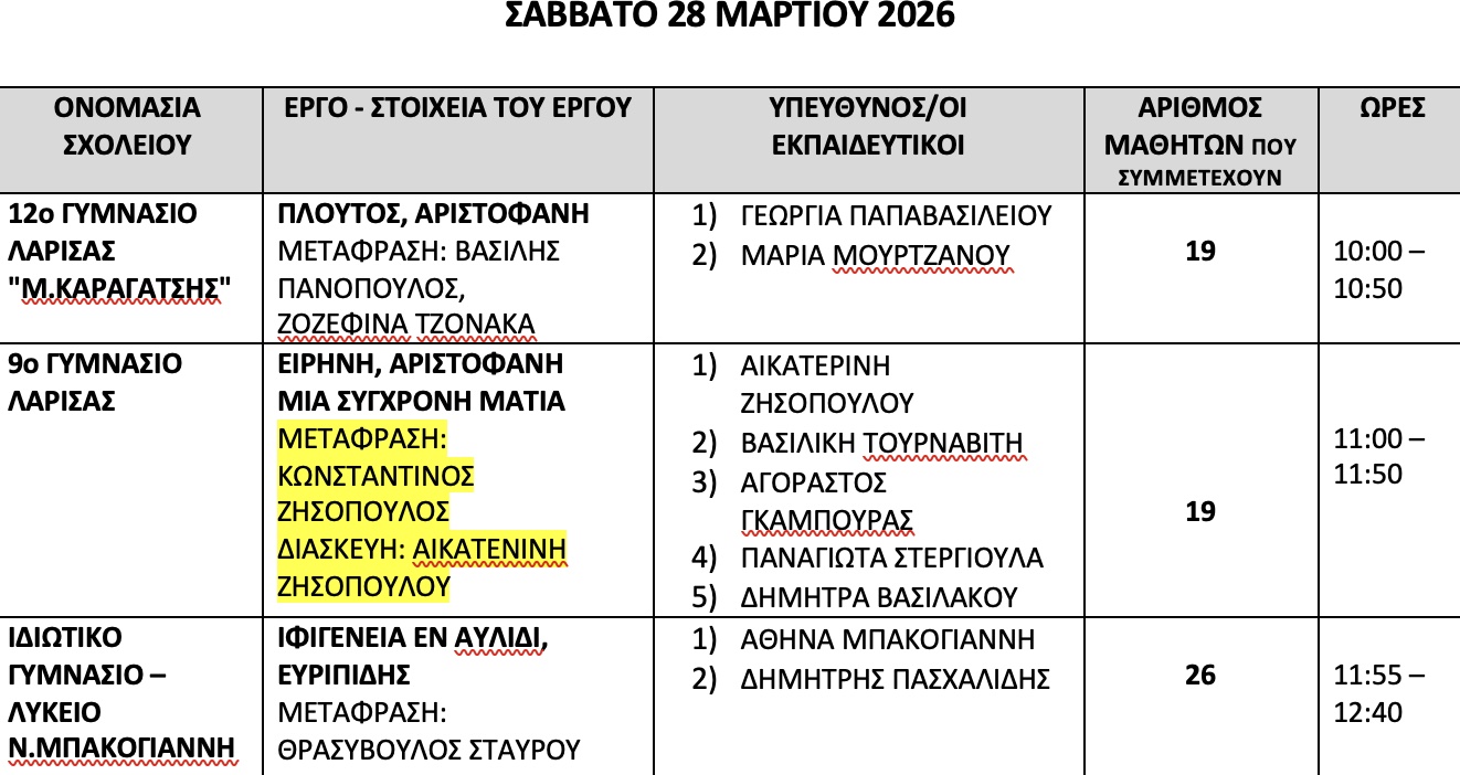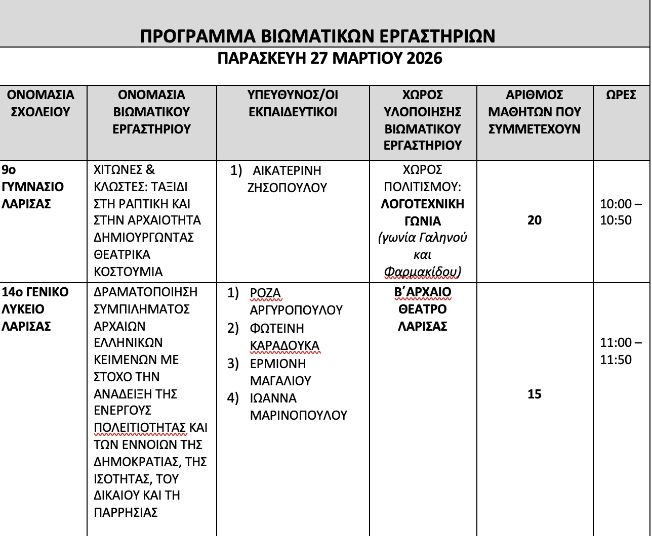 Το 2ο ΜΑΘΗΤΙΚΟ ΦΕΣΤΙΒΑΛ ΑΡΧΑΙΟΥ ΘΕΑΤΡΟΥ «Εφήβων δρώμενα 2026» θα υλοποιηθεί στο χώρο του Α΄ Αρχαίου Θεάτρου Λάρισας, από 26 έως 30 Μαρτίου 2026 με τη συμμετοχή μαθητών και μαθητριών σχολείων της Διεύθυνσης Δευτεροβάθμιας Εκπαίδευσης Λάρισας και σχολείων από την Ιταλία.
