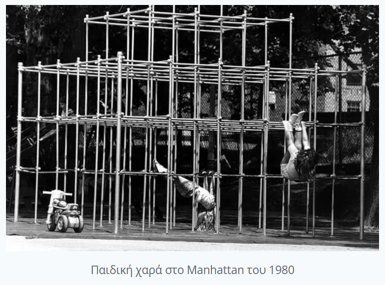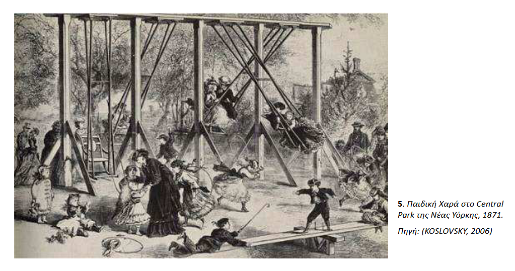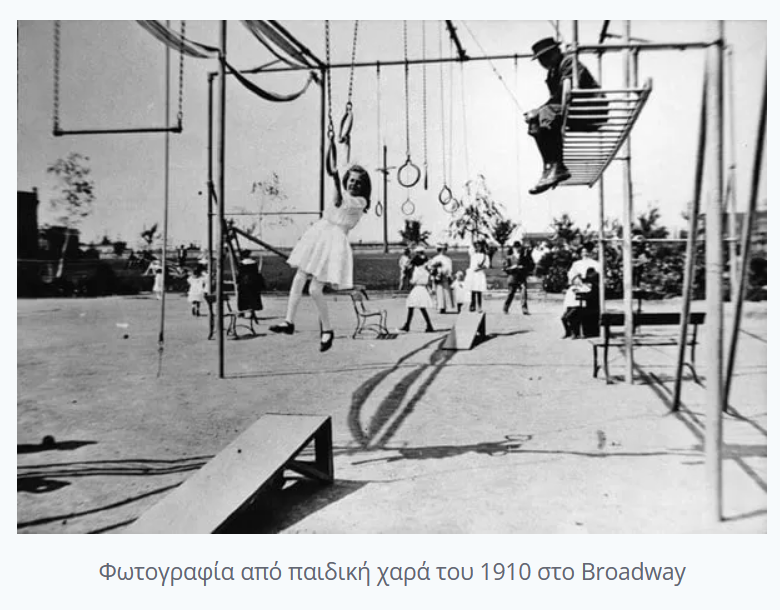 Θα έλεγες ότι είναι ένα φαινόμενο, που γεννιέται μαζί με τη δυτική μητρόπολη όπως αυτή διαμορφώθηκε το 19ο αιώνα και τη συνοδεύει έκτοτε ως αναπόσπαστο στοιχείο του ιστού της. Η παιδική χαρά είναι ένας χώρος αφιερωμένος στην κατεξοχήν ενασχόληση των παιδιών, το παιχνίδι. Αποτέλεσε την προσφερόμενη εναλλακτική στους κινδύνους των δρόμων της πόλης, το προστατευμένο μέρος για το παιδικό παιχνίδι υπό την επίβλεψη ενηλίκων.