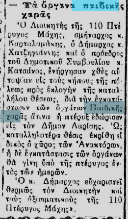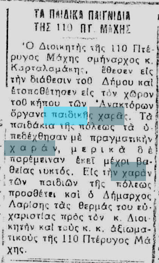 Την 1 Σεπτεμβρίου του 1954 η εφημερίδα «Θεσσαλικά Νέα» κάνει την πρώτη αναφορά. Στο επίμαχο δημοσίευμα ο Διοικητής της 110 Πτέρυγας Μάχης σμήναρχος Καρταλαμάκης κυκλοφορεί στην πόλη με τον δήμαρχο Χατζηγιάννη κάνοντας αυτοψία στους κήπους της Λάρισας προκειμένου να εντοπιστεί η κατάλληλη θέση για να τοποθετηθούν τα όργανα παιδικής χαράς που θα δώριζε στο Δήμο. Επιλέχθηκε ο Κήπος των Ανακτόρων.