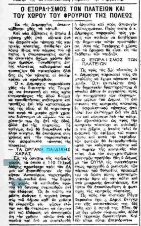 Μάλλον αυτό ήταν το πρώτο ορόσημο. Το δεύτερο είναι το 1954. Επί δημαρχίας Χατζηγιάννη δημιουργείται η πρώτη παιδική χαρά με δωρεά από την 110 Πτέρυγα Μάχης.