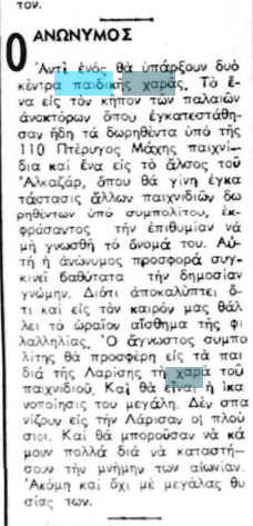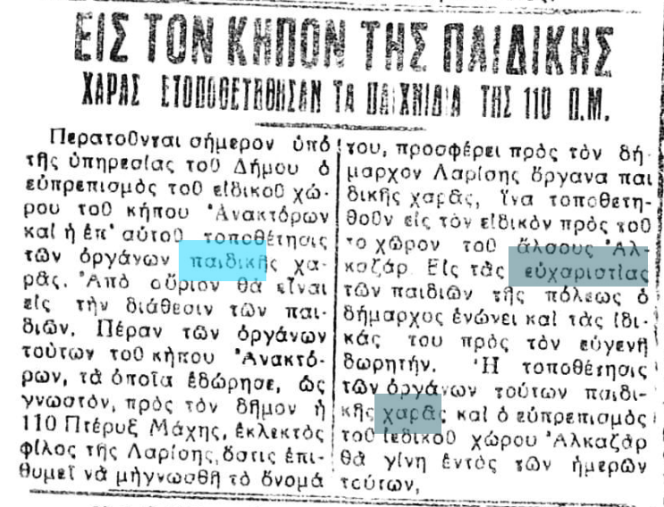 Η πρώτη πληροφορία που είχα ήταν ότι η πρώτη παιδική χαρά στη Λάρισα ήταν αυτή επί της Αιόλου και Αυξεντίου. Λάθος.