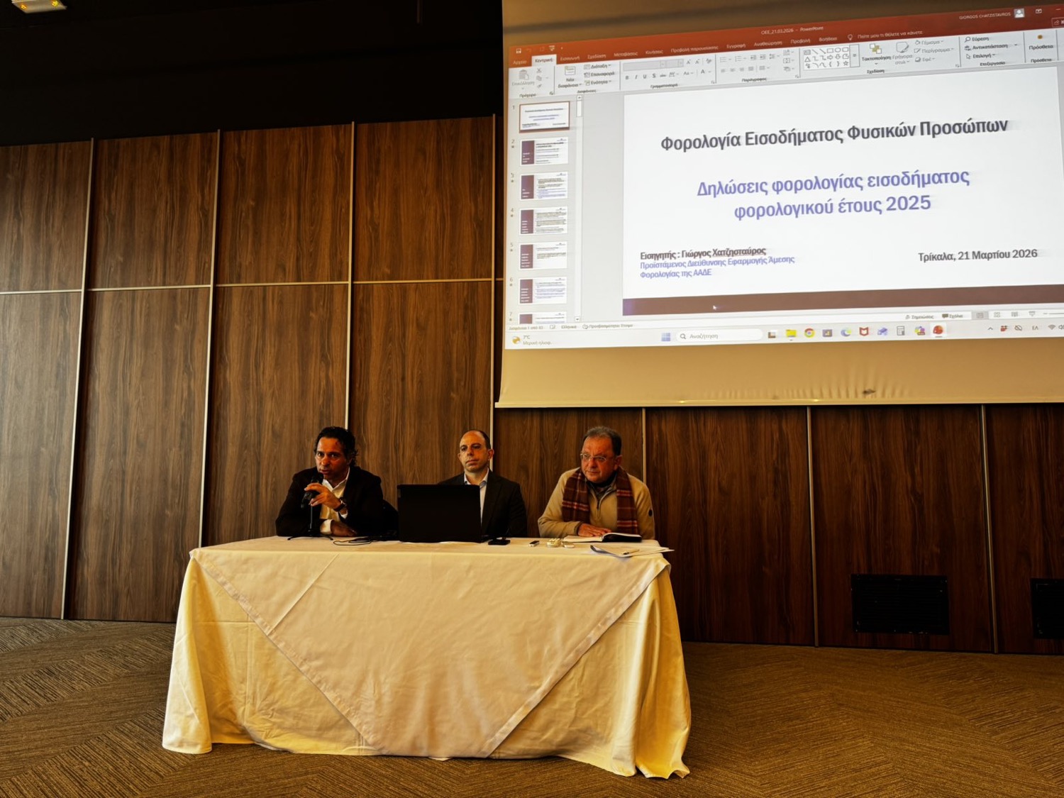 Με μεγάλη επιτυχία και συμμετοχή ολοκληρώθηκε το Σάββατο 21 Μαρτίου 2026, το σεμινάριο του ΠΤ Θεσσαλίας (7ο ΠΤ) του Οικονομικού Επιμελητηρίου της Ελλάδας με θέμα: «Φορολογία Εισοδήματος Φυσικών Προσώπων» στα Τρίκαλα στο ξενοδοχείο ΑΝΑΝΤΙ, με εισηγητή τον: Γεώργιο Χατζησταύρο, Προϊστάμενο Δ/νσης Εφαρμογής Άμεσης Φορολογίας της Γενικής Δ/νσης Φορολογίας της ΑΑΔΕ.