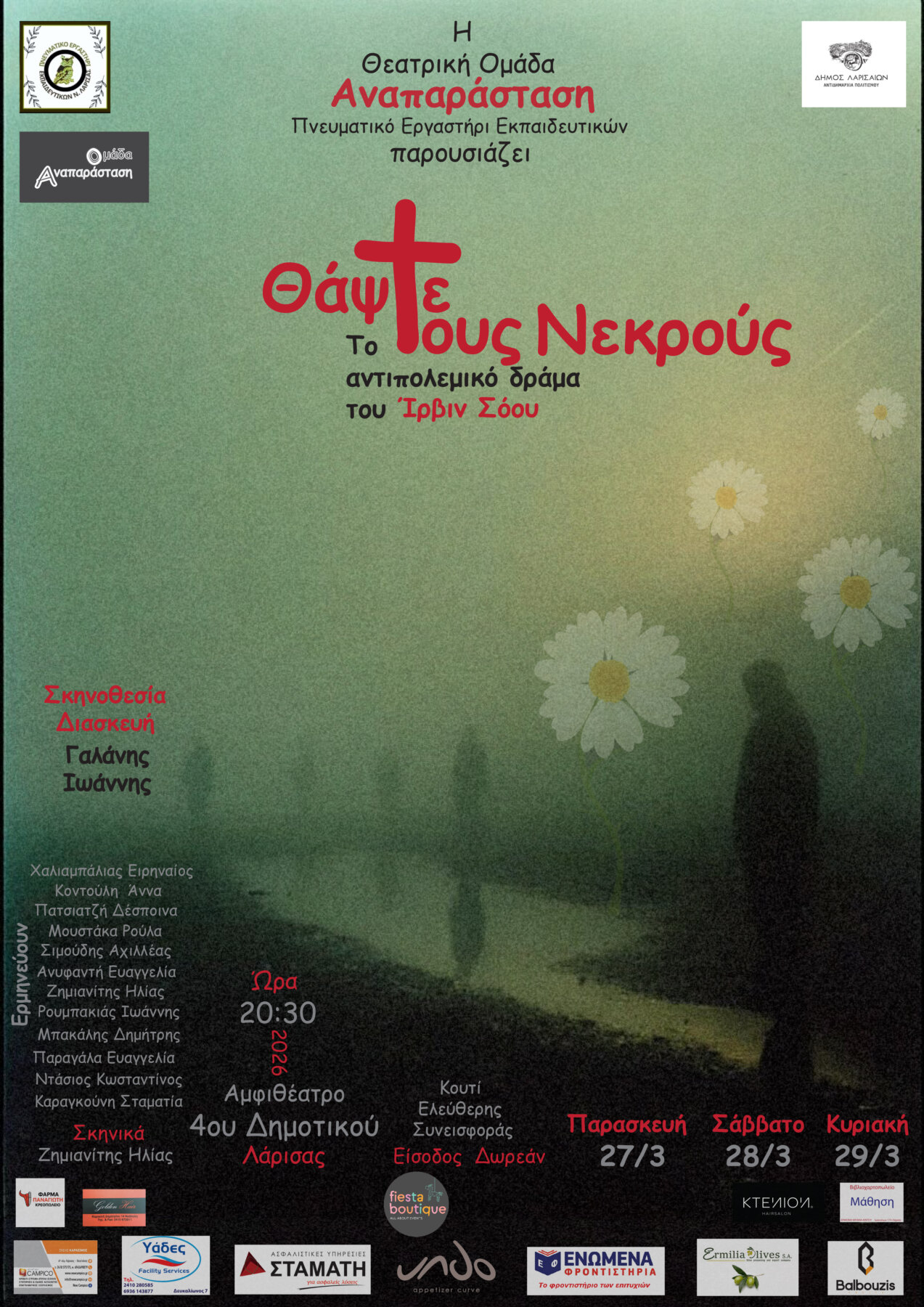 Η Θεατρική Ομάδα Εκπαιδευτικών Αναπαράσταση του συλλόγου Πνευματικό Εργαστήρι Εκπαιδευτικών του Ν.Λάρισας παρουσιάζει το αντιπολεμικό δράμα του του Ίρβιν Σόου «Θάψτε τους Νεκρούς»