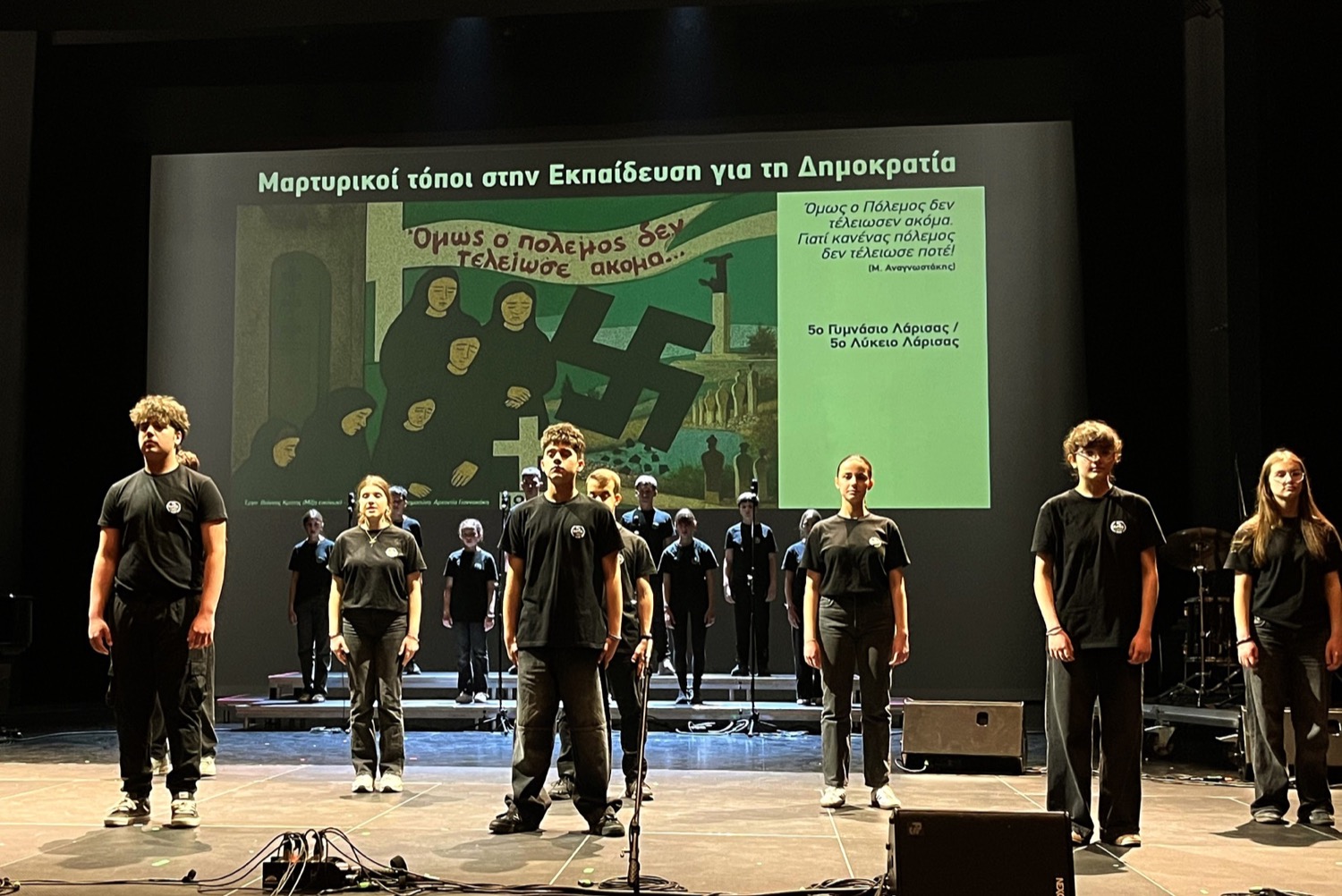 Στη συνέχεια, η χορωδία του προγράμματος, υπό τη διεύθυνση της εκπαιδευτικού Μουσικής του 5ου Γυμνασίου, Εύας Μωυσιάδου και με τη συμμετοχή του εκπαιδευτικού του 5ου Λυκείου, Χρήστου Πουλούλη, ερμήνευσε τρία τραγούδια που συνδέουν την ιστορική μνήμη της Αντίστασης με τις σύγχρονες πολεμικές συγκρούσεις και τις επιπτώσεις τους, ιδιαίτερα στα παιδιά.