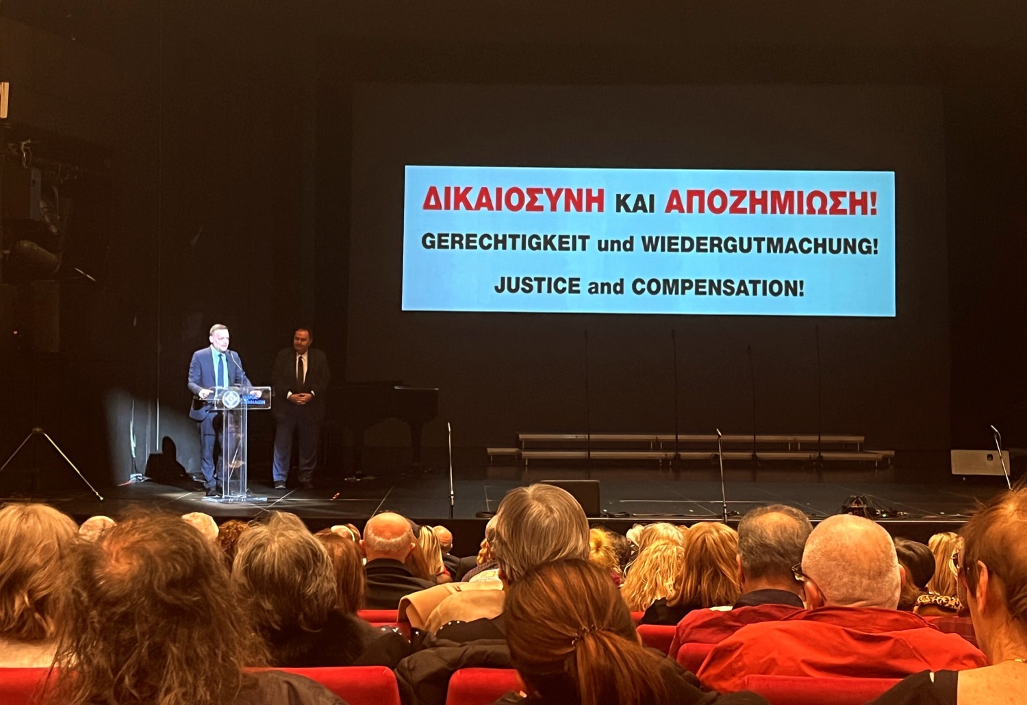 Χαιρετισμό απηύθυνε ο Δήμαρχος Αθηναίων, κ. Χάρης Δούκας, υπογραμμίζοντας ότι «το αίτημα των γερμανικών αποζημιώσεων παραμένει επίκαιρο, τόσο λόγω της ιστορικής μνήμης όσο και της ηθικής του διάστασης. Σε μια εποχή που η Ευρώπη δίνει ιδιαίτερη έμφαση στην καταπολέμηση του αναθεωρητισμού, η αναφορά σε αυτές τις προτεραιότητες αποκτά νέο νόημα».