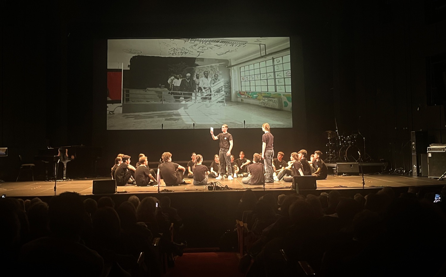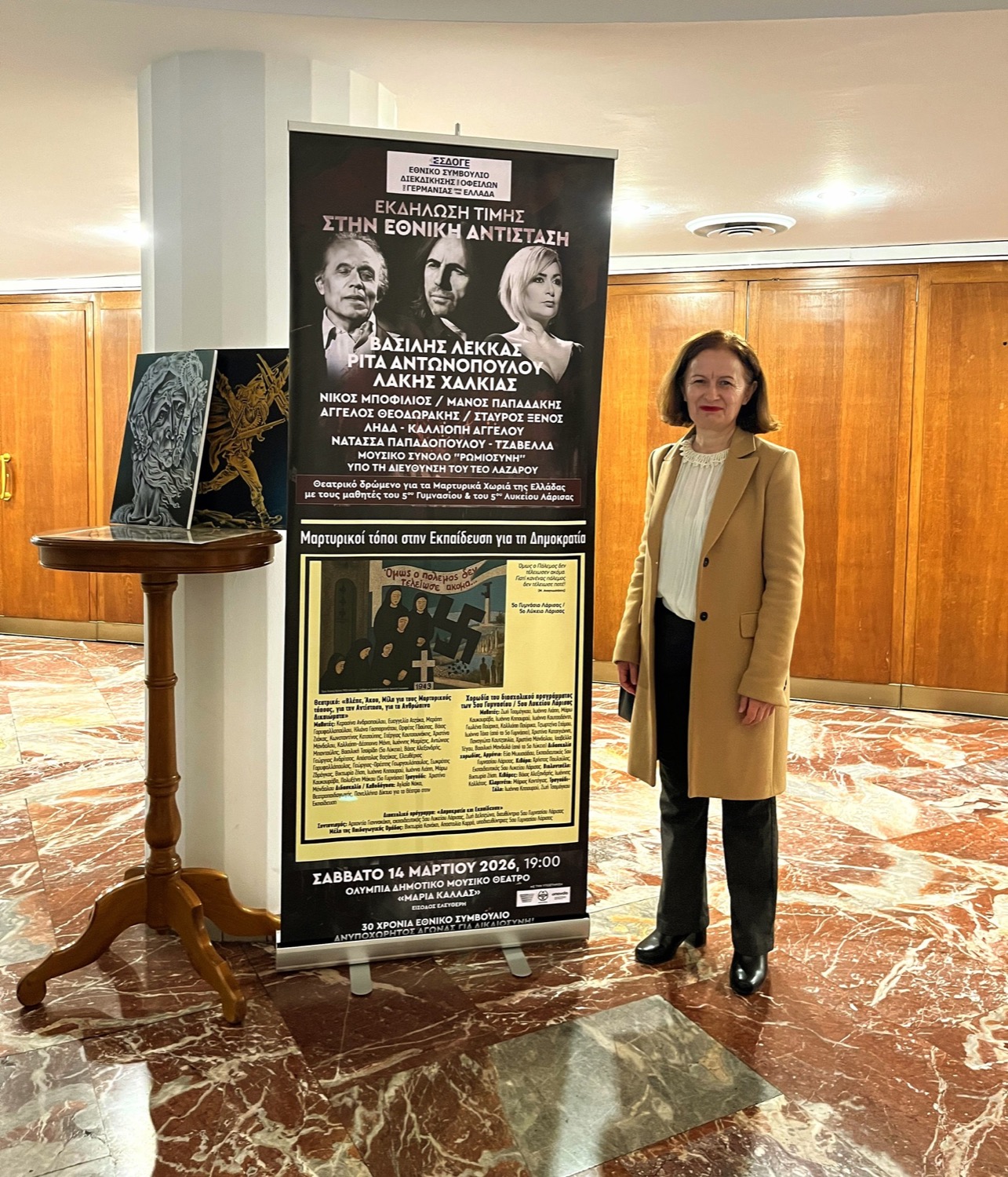 Κατά τη διάρκειά της, η θεατρική ομάδα του διασχολικού προγράμματος, με την καθοδήγηση της θεατροπαιδαγωγού Αγλαΐας Νάκα, συγκίνησε βαθιά το κοινό στο κατάμεστο θέατρο, παρουσιάζοντας το επιτυχημένο δρώμενο «Βλέπε, Άκου, Μίλα», αφιερωμένο στους Μαρτυρικούς Τόπους της χώρας, με ιδιαίτερη αναφορά στη Θεσσαλία. Το έργο, το οποίο έχει δημιουργηθεί στο πλαίσιο του προγράμματος και έχει ήδη παρουσιαστεί σε δημόσιες εκδηλώσεις στη Λάρισα και την Κρήτη, απέδωσε μέσα σε μόλις μισή ώρα την οδύνη των ολοκαυτωμάτων και το μεγαλείο της Αντίστασης, κορυφώνοντας με τα σημειώματα των 200 εκτελεσμένων κομμουνιστών της Καισαριανής.