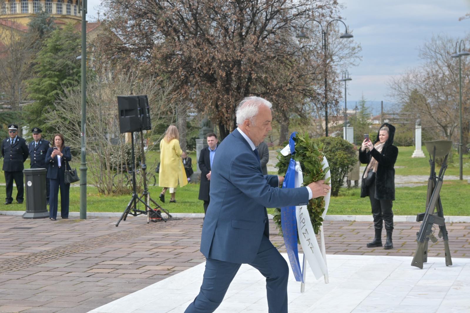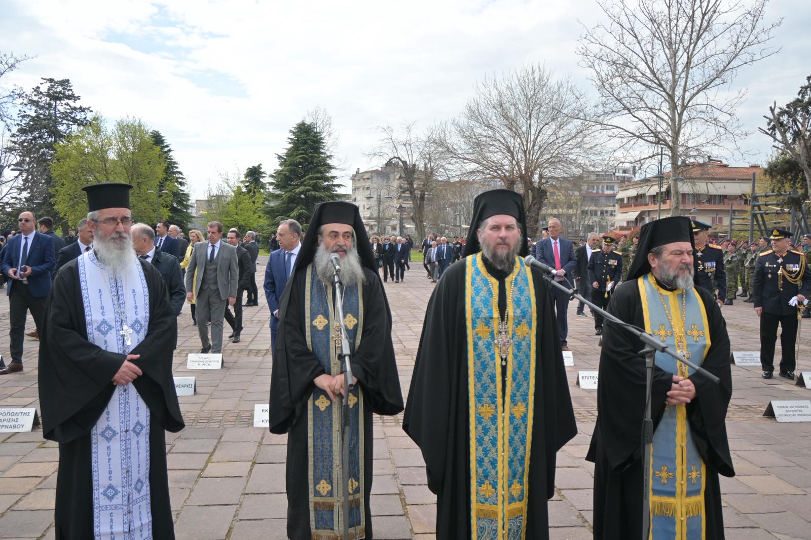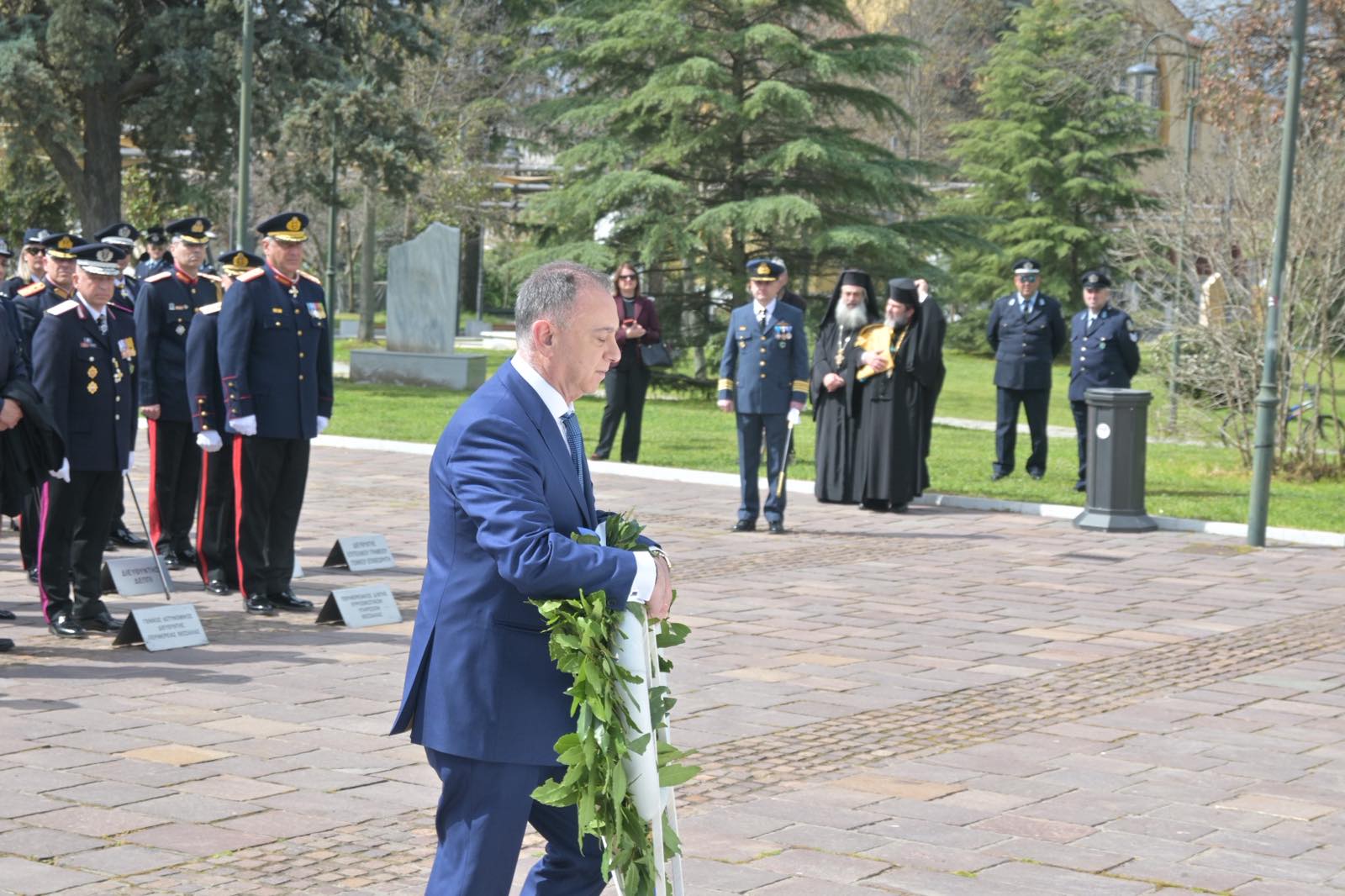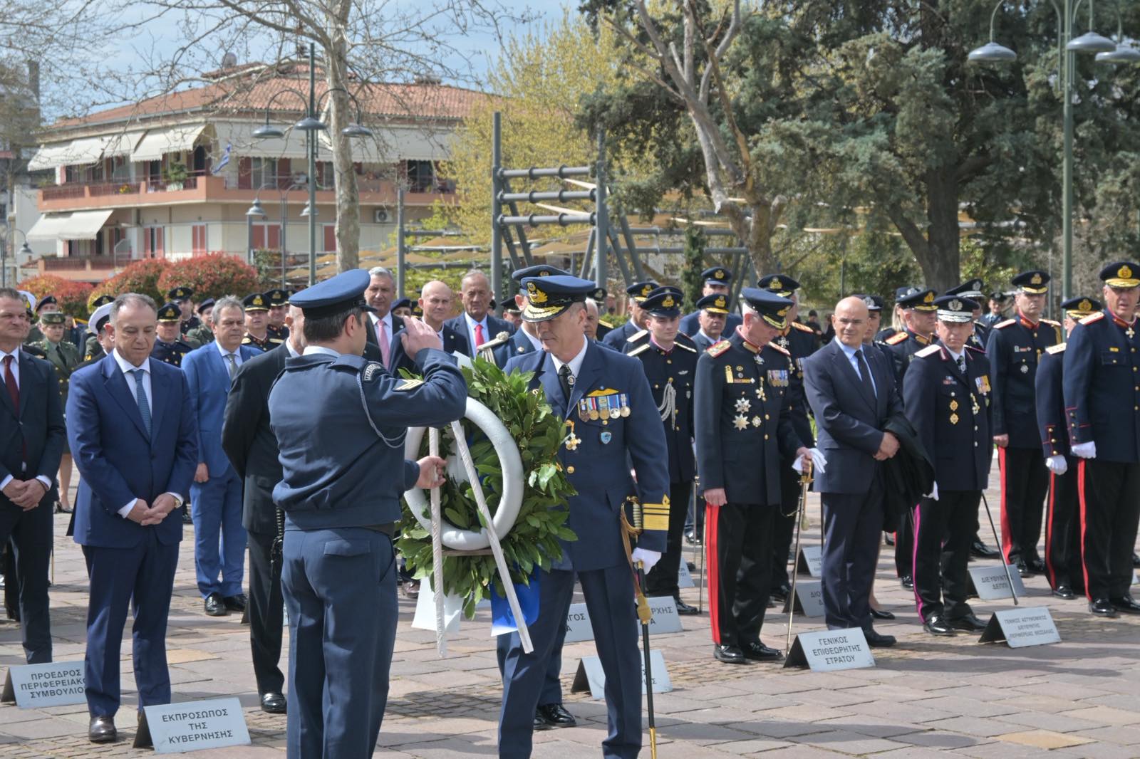 Αμέσως μετά την πανηγυρική δοξολογία που εψάλη στον Ιερό Ναό του Αγίου Αχιλλίου, πολιτικοί και στρατιωτικοί φορείς βρέθηκαν στο Ηρώο Πεσόντων.