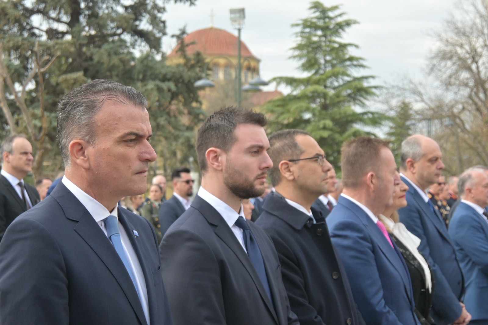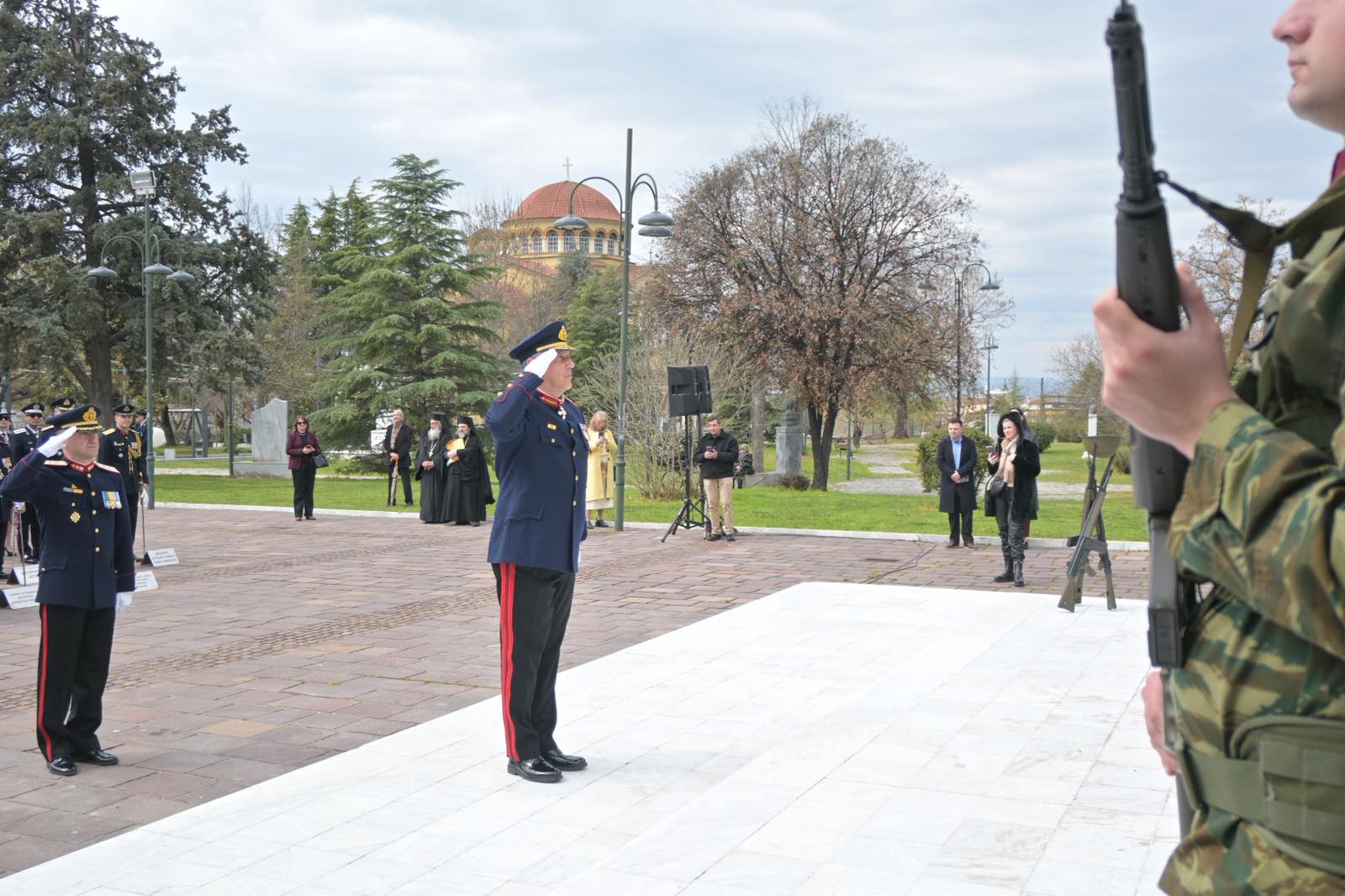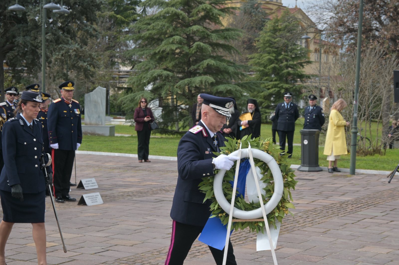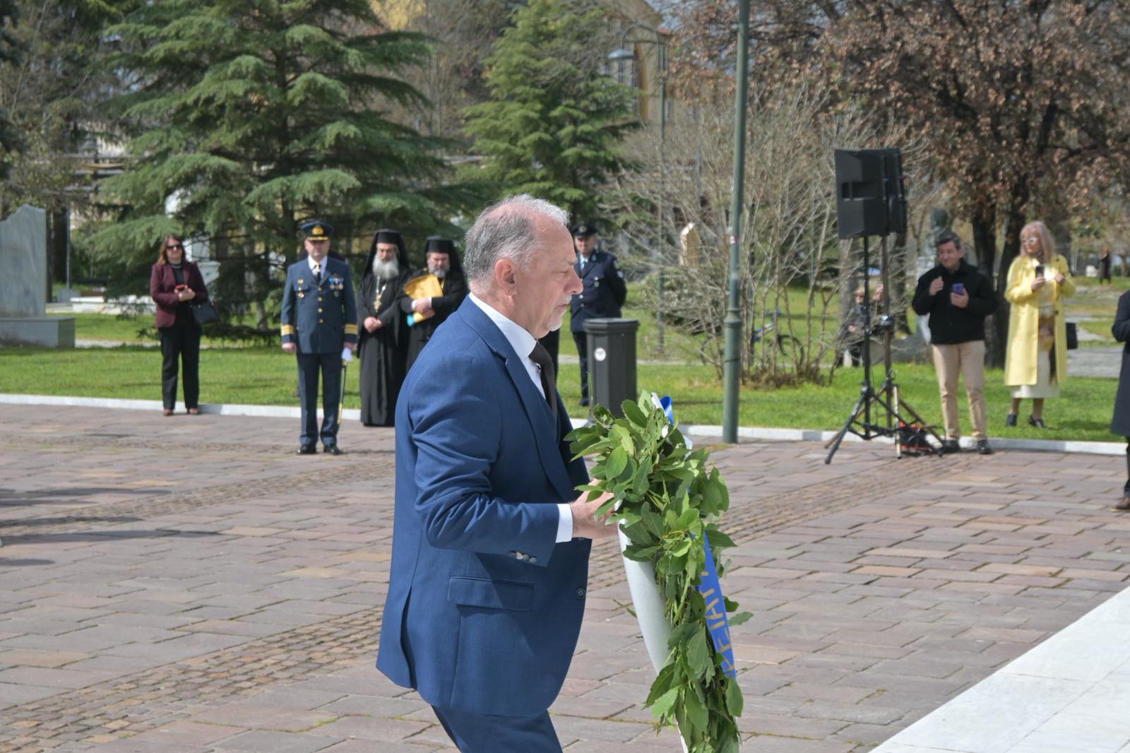 Αμέσως μετά την πανηγυρική δοξολογία που εψάλη στον Ιερό Ναό του Αγίου Αχιλλίου, πολιτικοί και στρατιωτικοί φορείς βρέθηκαν στο Ηρώο Πεσόντων.